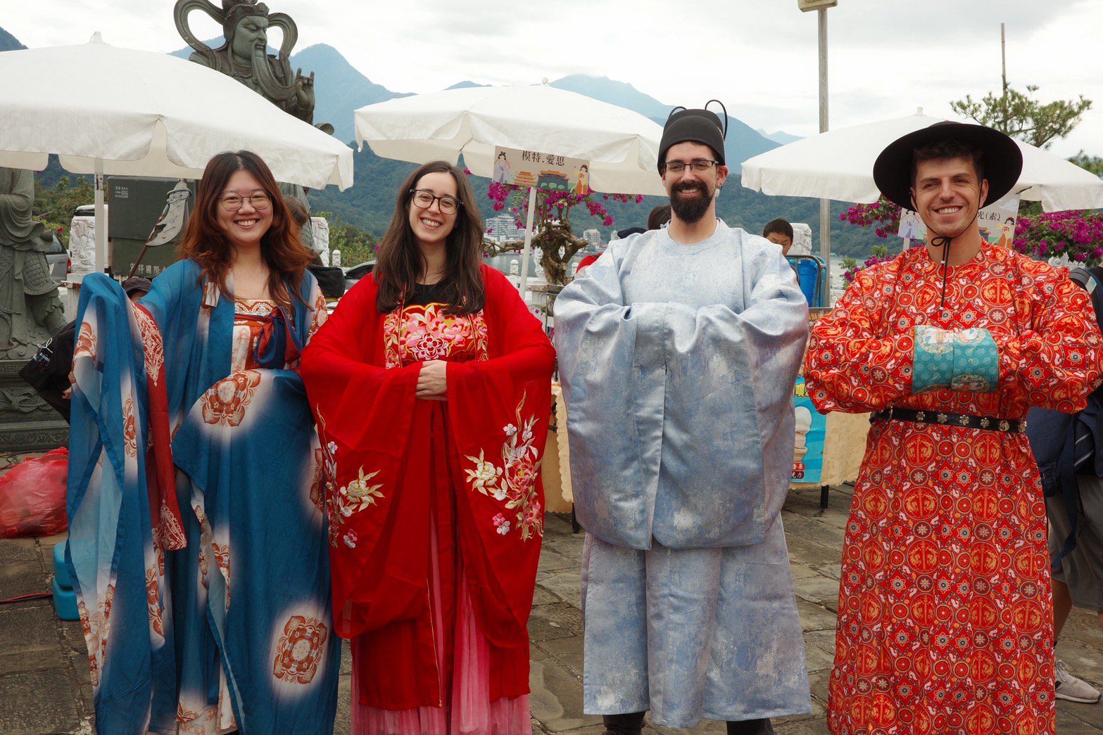 圖片-結合漢服推廣宗教文化觀光 台灣寺廟文化藝術節文武廟熱鬧登場這項活動邀請文化推廣代表,身著古裝漢服,上午先到埔里地母廟巡禮,下午再到日月潭文武廟舉辦開幕式,身著古裝的民眾,出現在廟中,宛如時光倒流,不僅引起遊客注目,優雅漢服襯托寺廟的建築,另有一番風情。