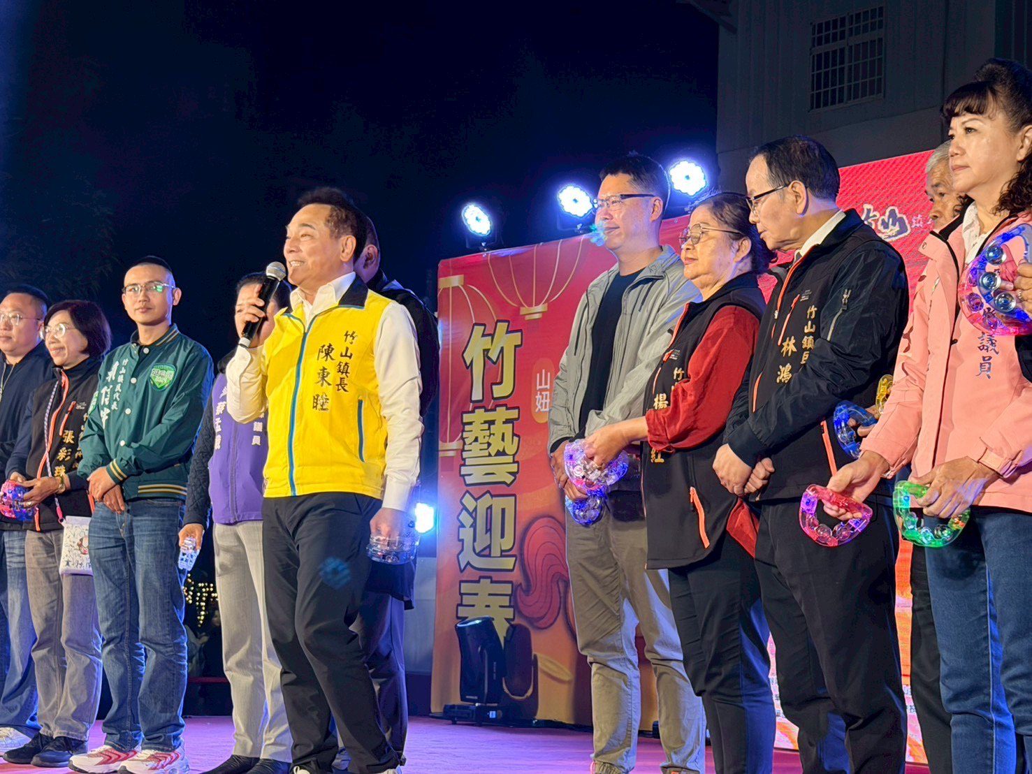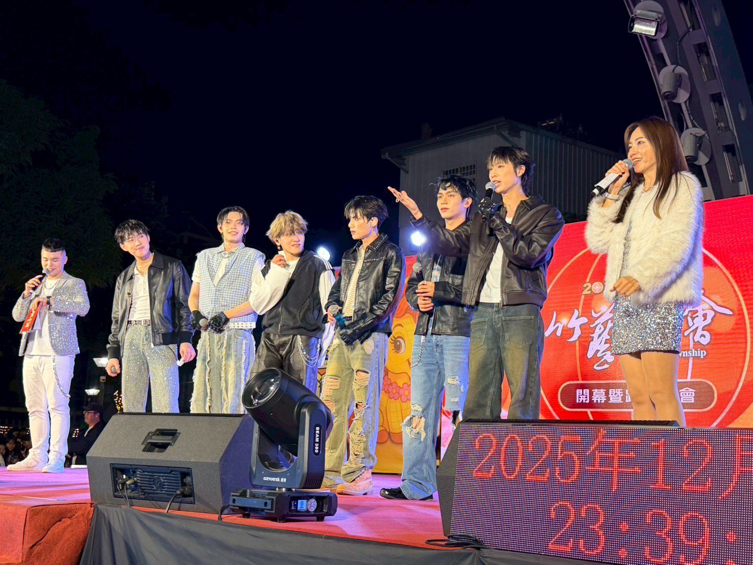 動力火車一登場,八里河畔立刻變成大型合唱現場,熟悉旋律一響,全場自動接唱。尤秋興還在台上分享新年新希望,笑說希望明年能長到 165 公分,主持人黃鐙輝立刻接招比高音,現場笑聲不斷,甚至當場「拜師學唱」,讓氣氛又嗨又鬧。
