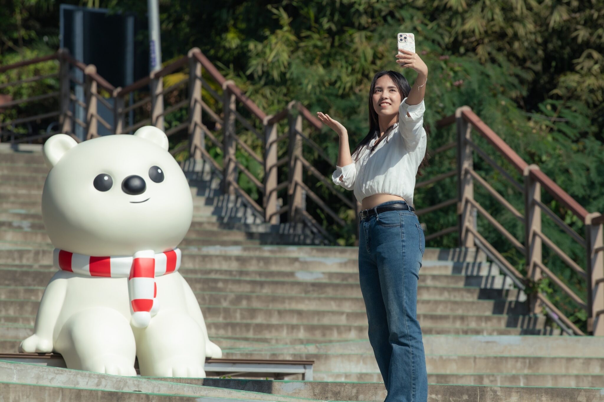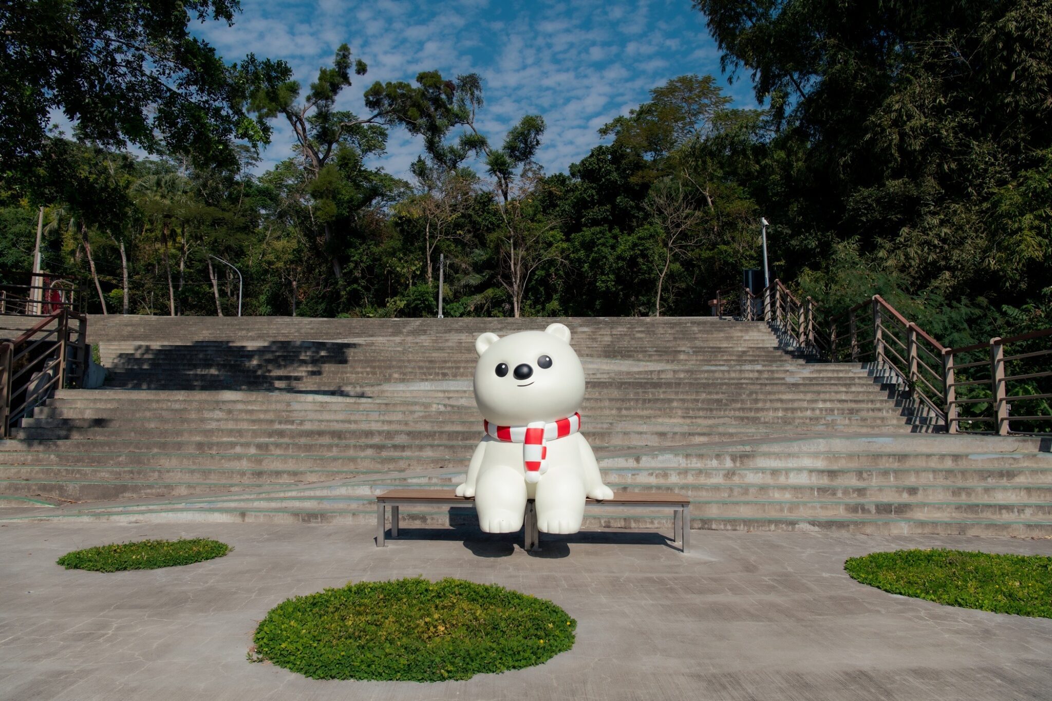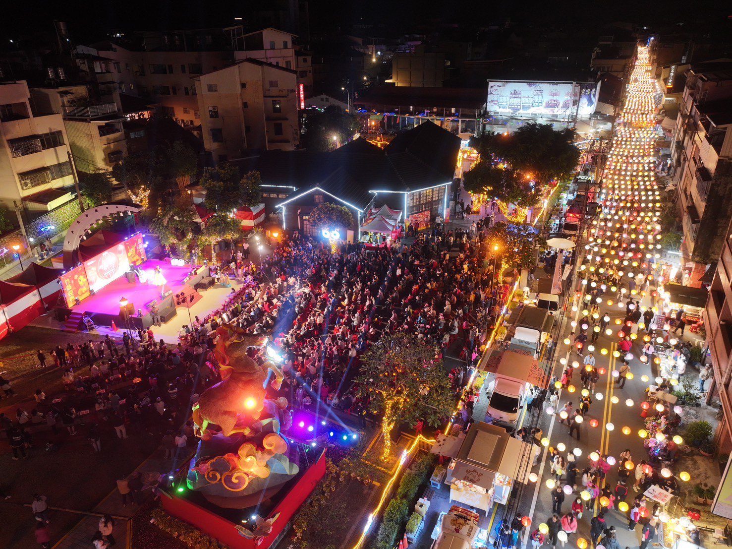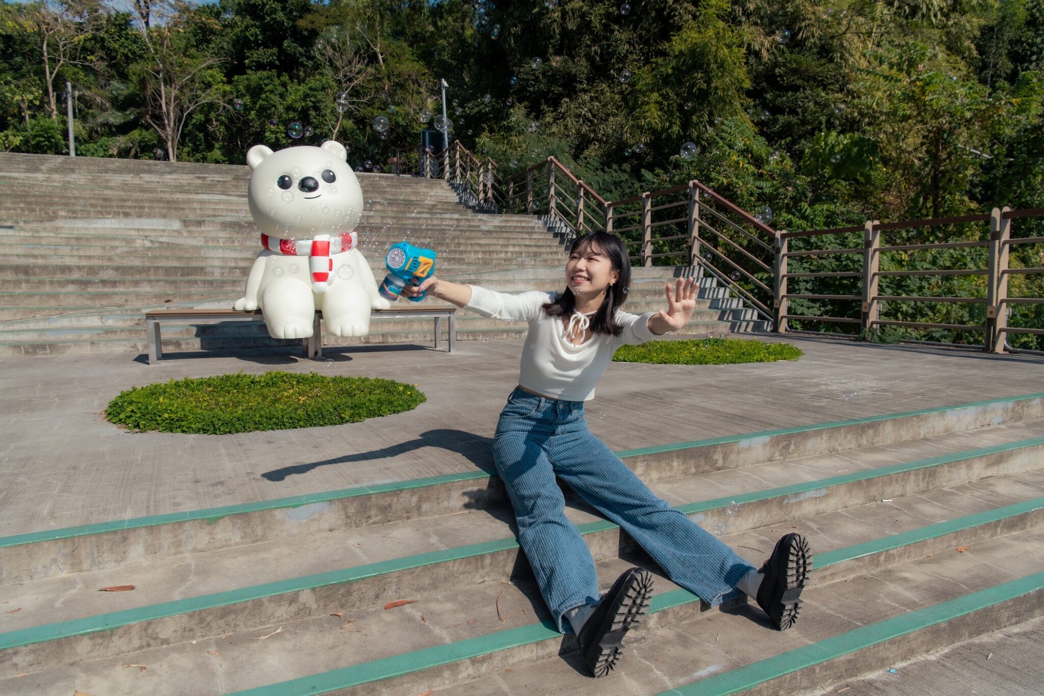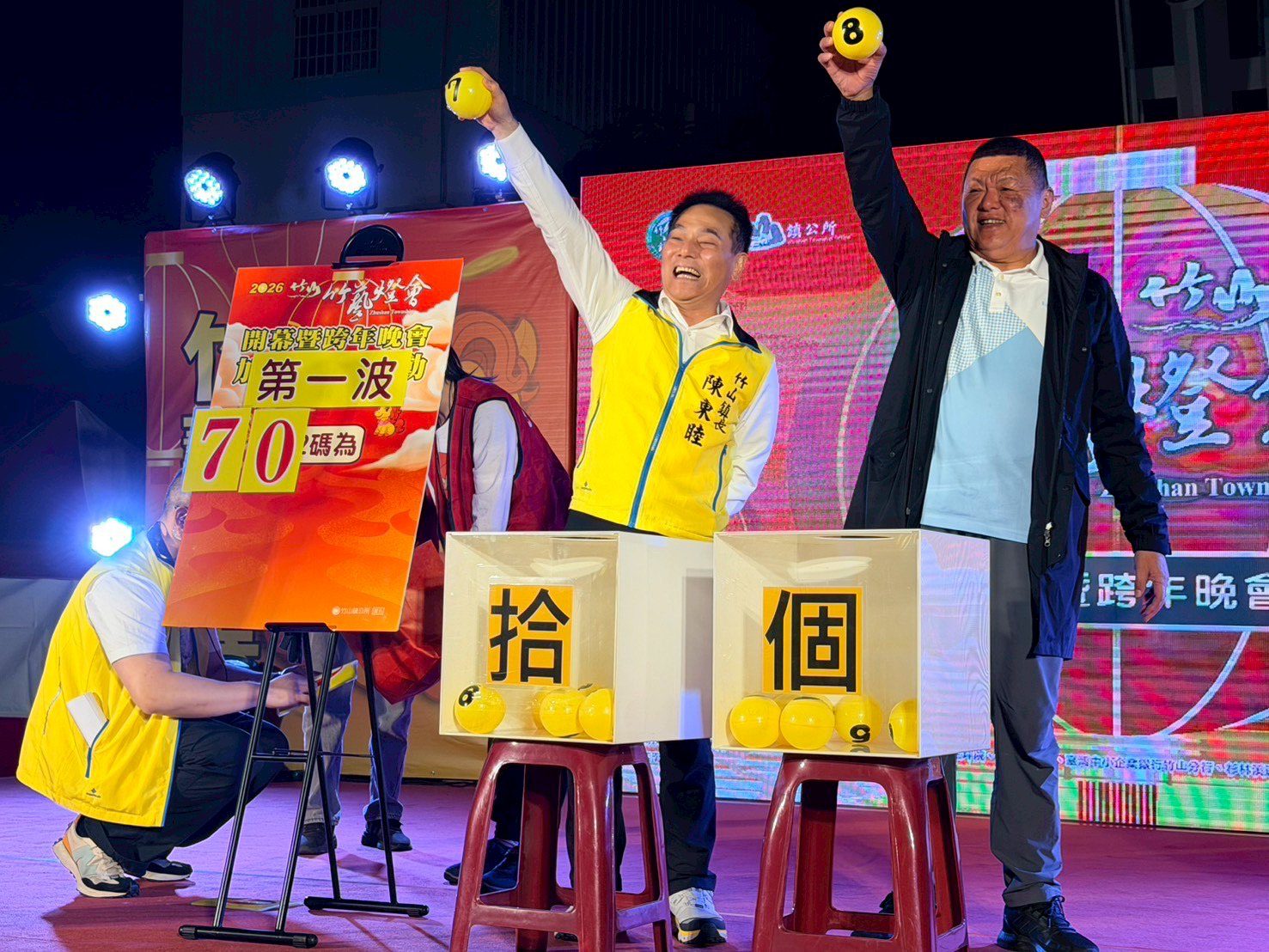 梁舒涵(右二)和小師弟 Dylan(右一)走下舞台分送糖果給現場民眾、預祝跨年快樂! 梁偉華/攝影