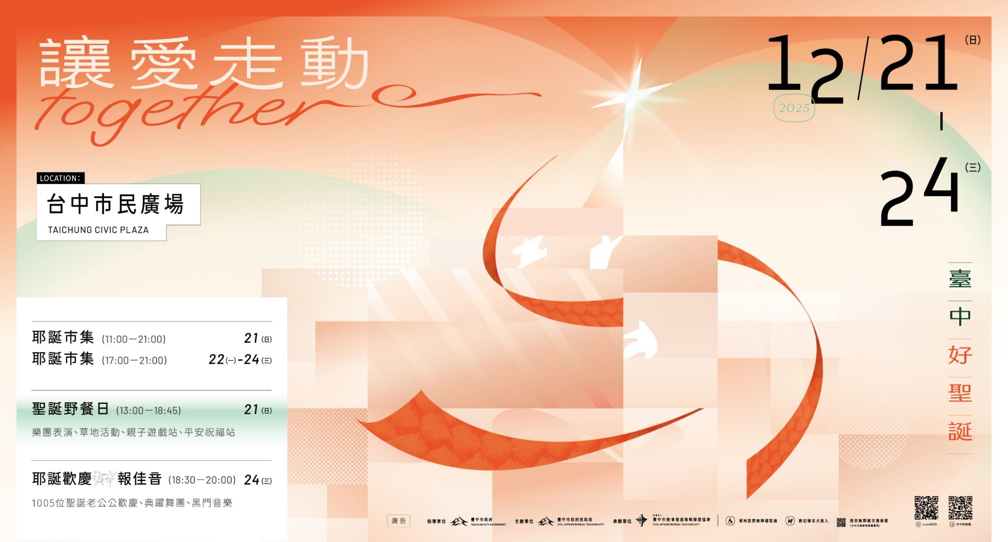 迎接溫馨耶誕佳節!台中市政府民政局攜手台中市教會發展策略聯盟協會,將於12月21日至24日在市民廣場舉辦「2025台中好聖誕-讓愛走動」系列活動,現場除打造9米高夢幻主燈「聚.光 | Gather the Light」,更結合耶誕市集、聖誕野餐日及歡慶Party報佳音等精彩內容。民政局長吳世瑋表示,平安夜當晚將集結1,005位聖誕老人齊唱詩歌報佳音,歡迎大家相約到市民廣場,共度冬季最浪漫、最充滿祝福的平安夜。
