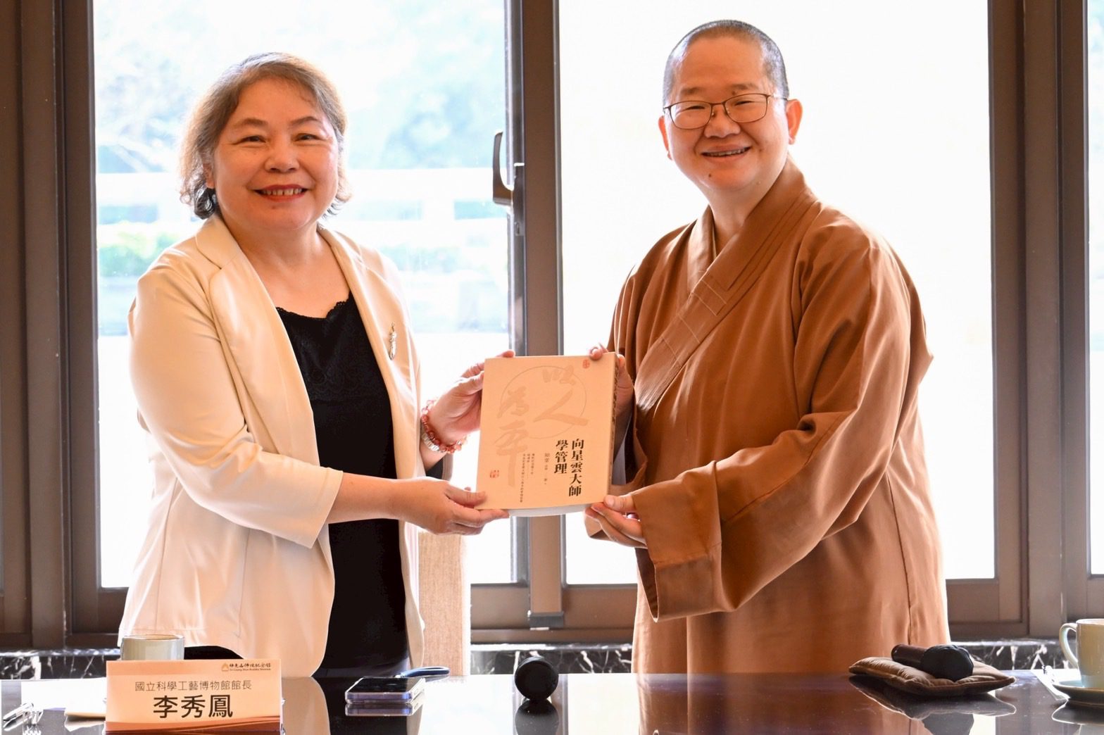 圖説:儀式由佛館館長如常法師(右)與科工館李秀鳳館長,雙方互贈禮物。(科工館提供)