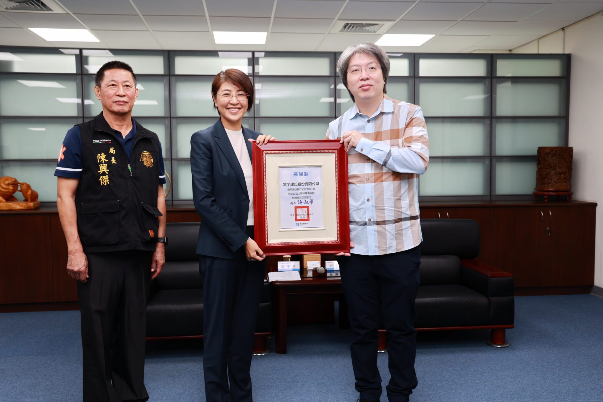 捐贈儀式於18日上午在縣長室舉 行。富宇慈善基金會執行長張宇承率富宇建設副理賈珮甄、企劃洪秋嫆等人出席,許縣長代表受贈,並表達縣府最誠摯的謝意。