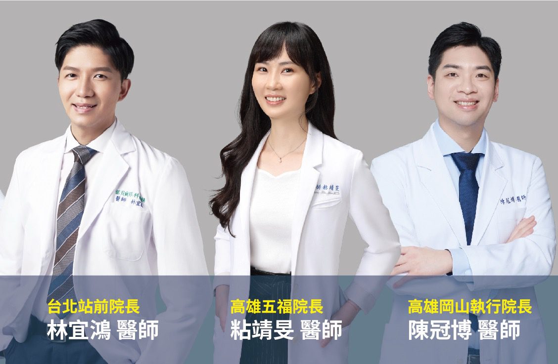 台北站前諾貝爾眼科院長林宜鴻、高雄五福諾貝爾眼科院長粘靖旻、高雄岡山諾貝爾眼科執行院長陳冠博。圖/諾貝爾眼科提供