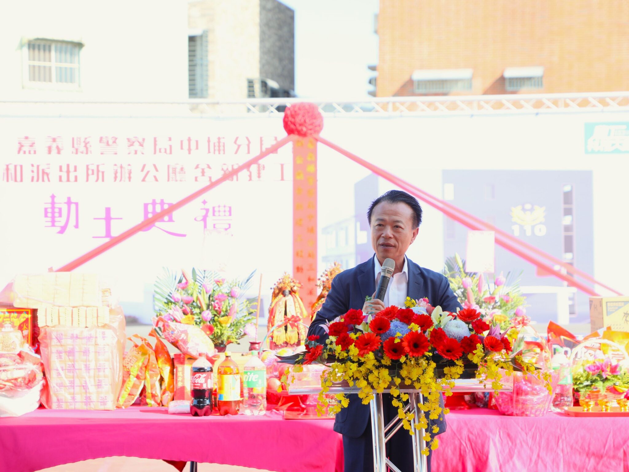 嘉義縣警察局今(8)日在中埔鄉舉辦三和派出所辦公廳舍新建工程動土典禮,由縣長翁章梁、縣議會議長張明達、議員陳柏麟、立委陳冠廷、警察局長李權哲及中埔鄉長李碧雲等人主持祭祀,祈求新建工程圓滿順利。