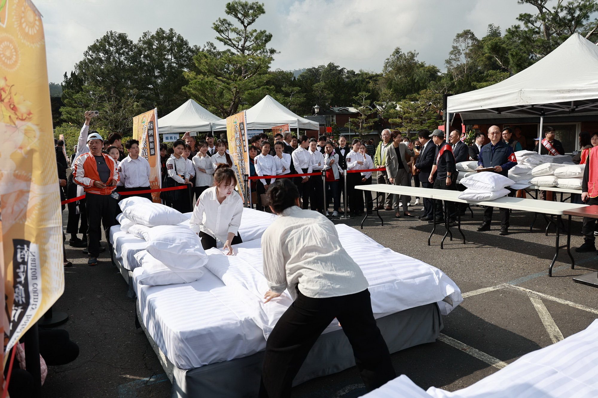由南投縣旅館商業同業公會舉辦的「2025台灣旅館節全國餐旅服務競賽」12月4日在日月潭瑞居渡假飯店盛大登場,共吸引83隊、超過200位選手報名參加「整床」與「托盤」競賽;縣長許淑華到場鼓勵所有參賽選手都能突破自己,互相交流學習,提升專業服務技能與品質。