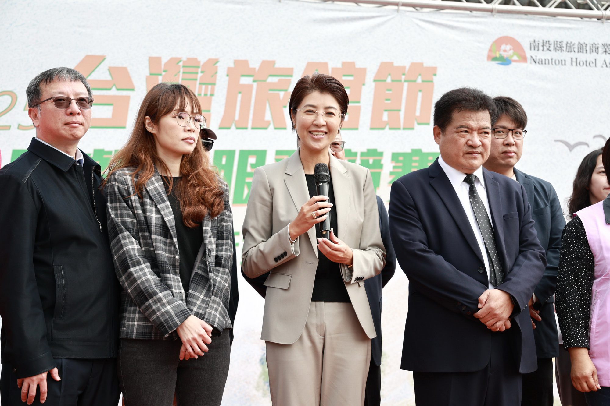 許縣長與南投縣旅館公會理事長李吉田、交通部觀光署旅宿組科長柯乃文、日月潭國家風景區管理處長柯建興、縣議員王秋淑、魚池鄉長劉啟帆等貴賓,共同啟動鳴笛,為活動開幕。