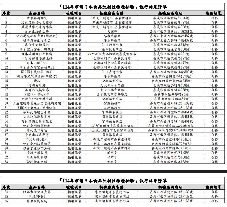 嘉義市抽驗36件日本食品,輻射檢測全數合格
