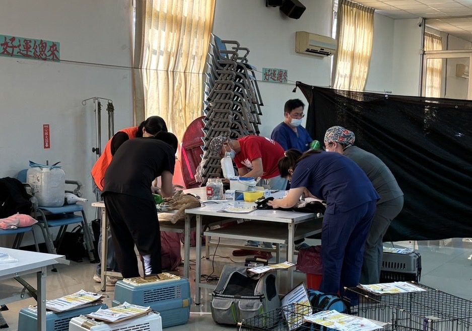 活動現場工作人員志工和獸醫師助理正在替參加活動的犬貓進行手術前準備