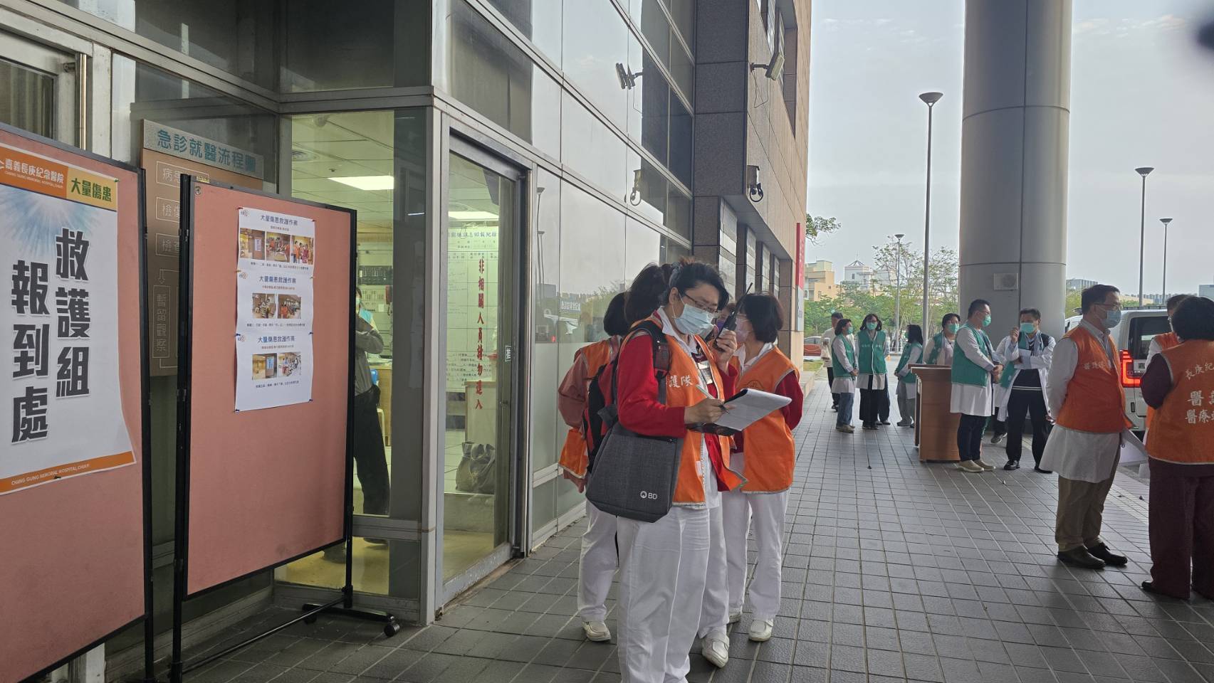 長庚醫院模擬因地震過後,載有二氯乙烷化學槽車因路面裂縫翻覆、槽內液體外洩,濺及後方機車騎士與附近路人,現場疑似有放射物質外洩情形、多人輕重傷,經消防局到場搜救與初步處理防止毒物外流,環保局會同環保署環境事故技術小組進行環境偵測與現場除污作業。