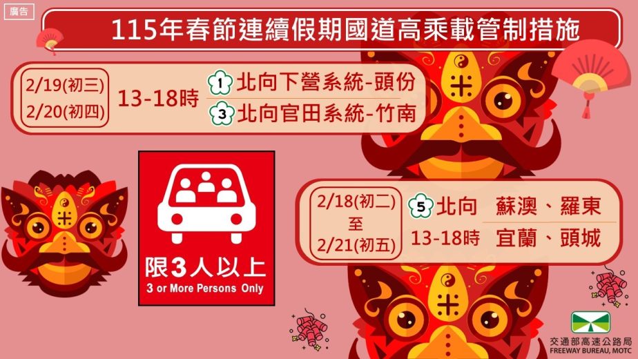 另本次春節連假之高乘載管制措施,國5北向於初二至初五實施,西部國道北向於初三、初四實施(如附圖4),請民眾多加留意並配合。高公局預祝大家春節假期快樂、行車平安。