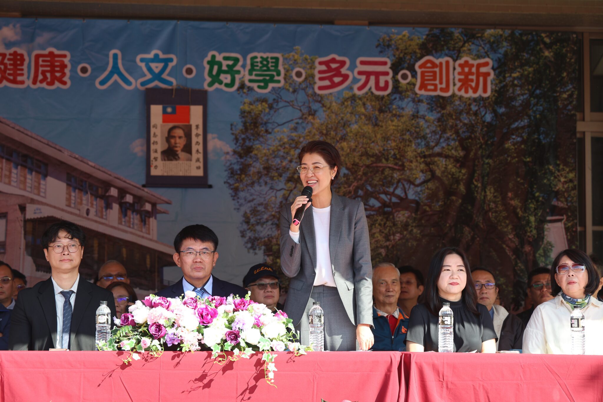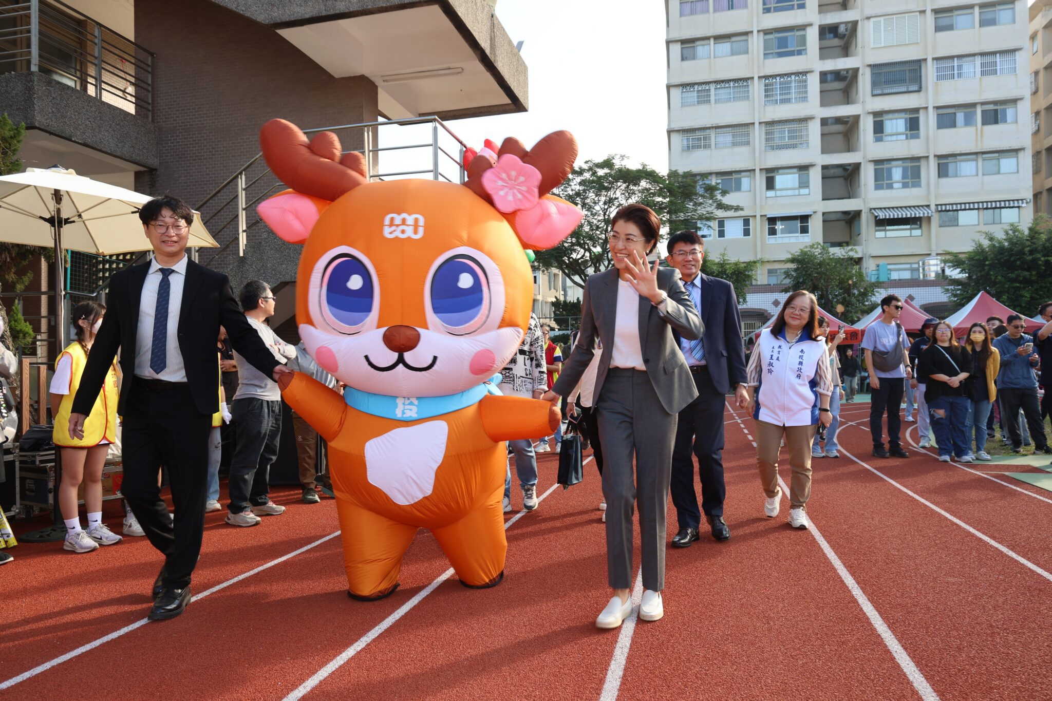 縣長許淑華率縣府教育處長王淑玲親自出席典禮並致詞,還手牽南投縣道安宣導吉祥物「這投鹿」笑臉洋溢的進場,參加典禮不忘宣導交通安全。她特別感謝立法委員馬文君的大力協助,從中央爭取到關鍵經費。縣長指出,富功國小自921地震後,跑道與周邊工程一直未能獲得完整修復,嚴重影響學童的活動安全和學習品質,最終在中央地方攜手投注1,800萬元,徹底改善921震災後遺留問題。