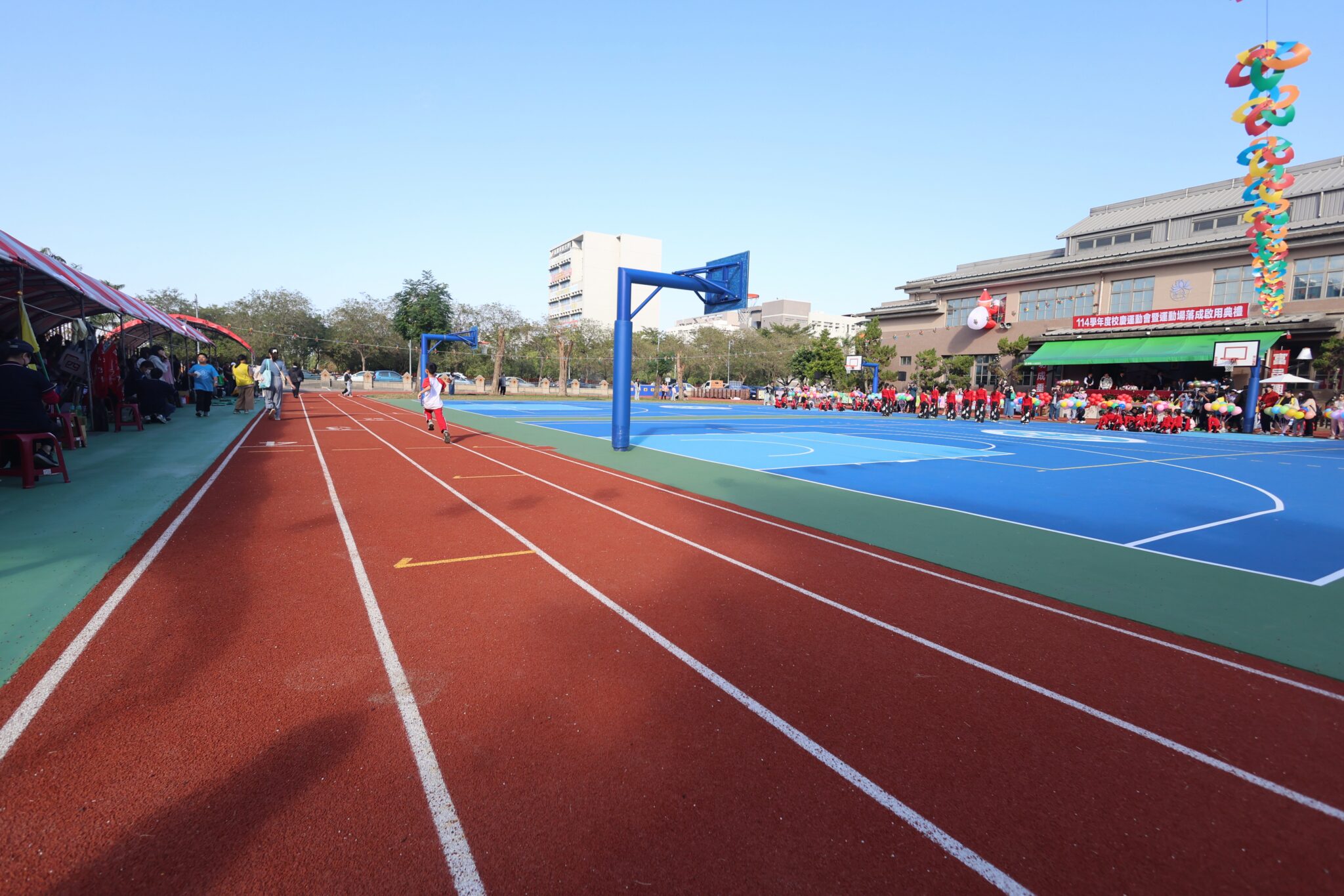 典禮在社區媽媽及小朋友的熱舞、直排輪表演中揭開序幕,校慶活動熱鬧,以行動開啟體育教育新里程碑,並透過與剪綵啟用儀式同步升空的五彩繽纷氣球,為活動掀起高潮,校慶運動會上,各年級表演節目、親子趣味競賽、田徑賽、大隊接力及拔河等活動輪番上陣,孩子們臉上洋溢著開心的笑容。