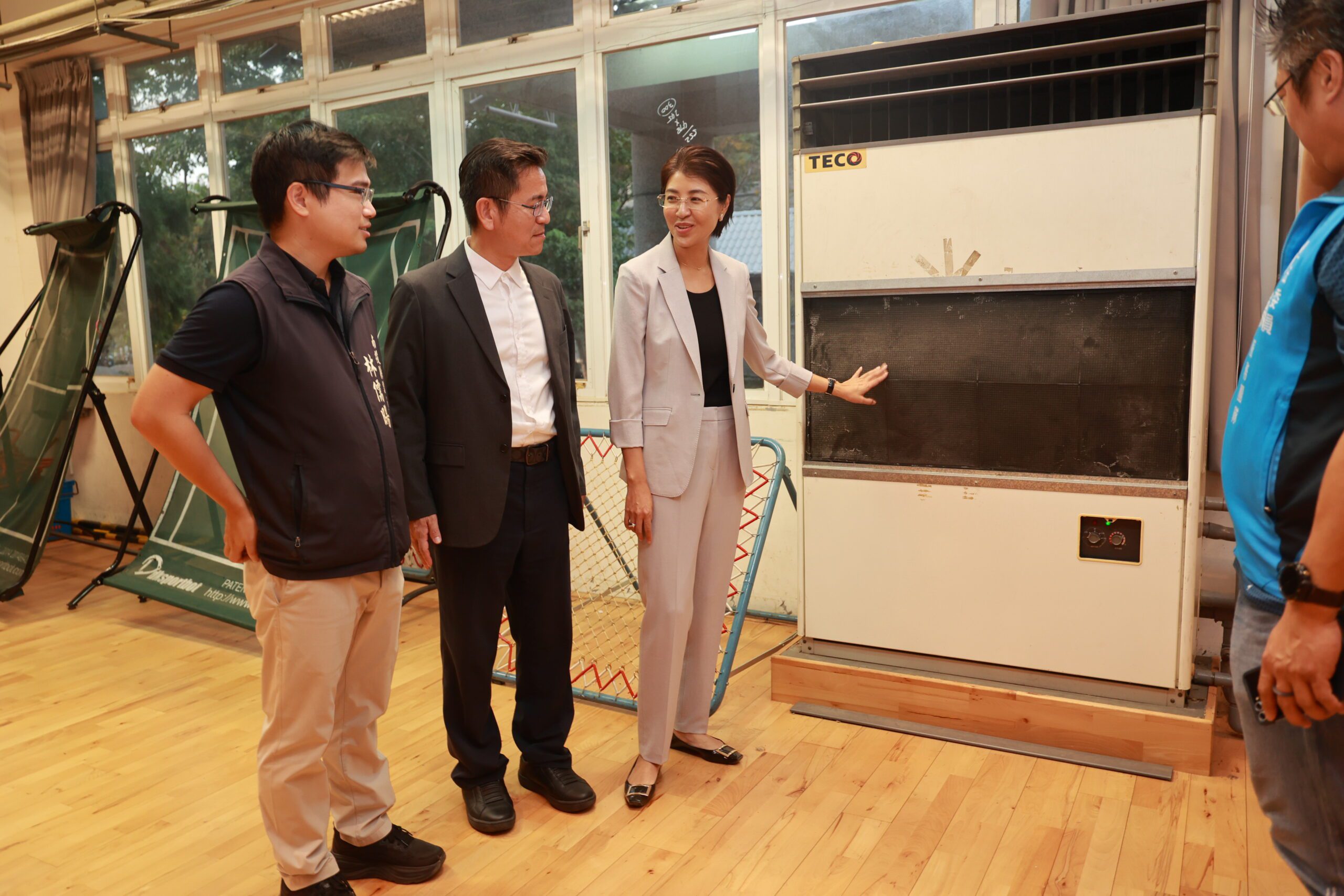 中興國中活動中心五台冷氣逾20年,校長鄭俊楠表示,現有冷氣老舊,濾網堵塞,冷媒效率差,維修率又高,冷氣耗電量越來越大,活動中心舉辦畢業典禮、班親會大型活動,家長反應太熱,學校希望汰換冷氣,經費約需229萬餘元,許縣長表示,中興國中學生人數多,活動中心現有冷氣設備的確不夠,縣府同意更換,一來可以改善學校環境,也能配合節能政策,展現環境永續教育。