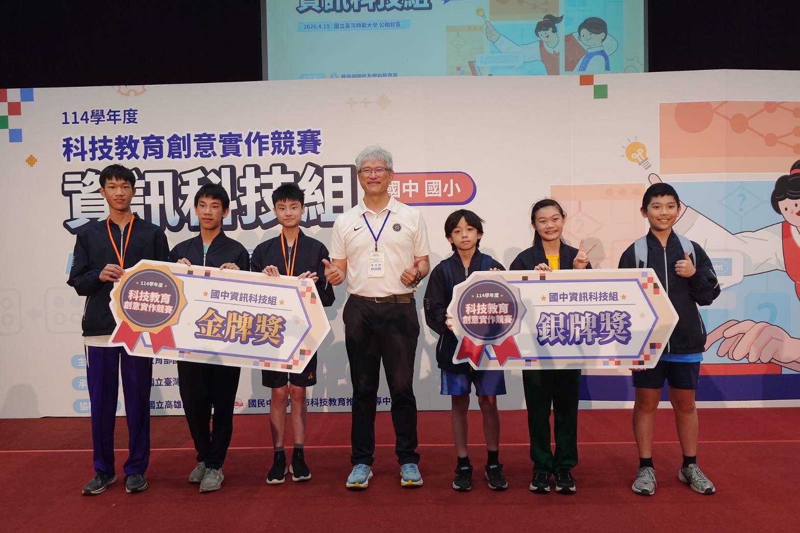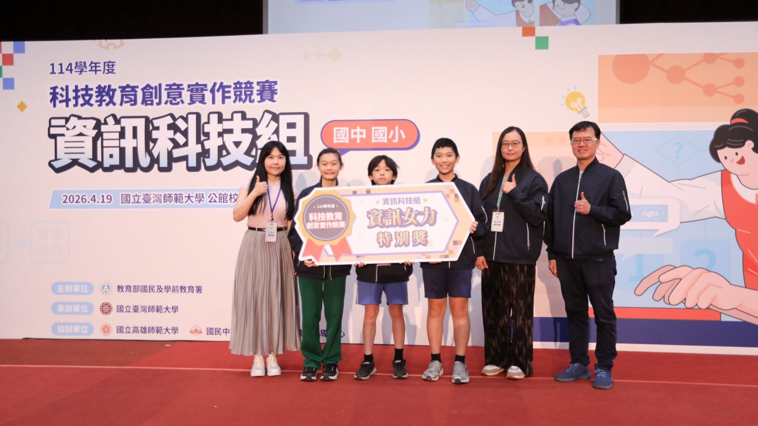 114學年度「科技教育創意實作競賽」資訊科技組全國決賽於115年4月19日圓滿落幕,臺北市代表隊在全國激烈競爭中表現亮眼,勇奪一金一銀,並榮獲「資訊女力特別獎」及「智策協作特別獎」,展現學生在科技領域深厚的學習成果與優異實作能力,「Team Taipei」再度以穩健實力於全國舞臺嶄露頭角。