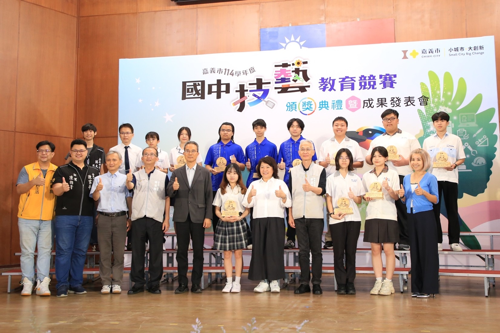嘉義市政府於今(15)日在北興國中活動中心隆重舉行「114 學年度國中技藝競賽頒獎典禮暨成果發表會」。 黃敏惠市長出席頒獎表揚今年獲獎學生178人及在全國高級中等學校技藝競賽榮獲「金手獎」的佳績學生11人,合計189人。典禮結合了精采的學生才藝表演與各校技職成果展示,充分展現嘉義市深耕技職教育、培育多元人才的豐碩成果。