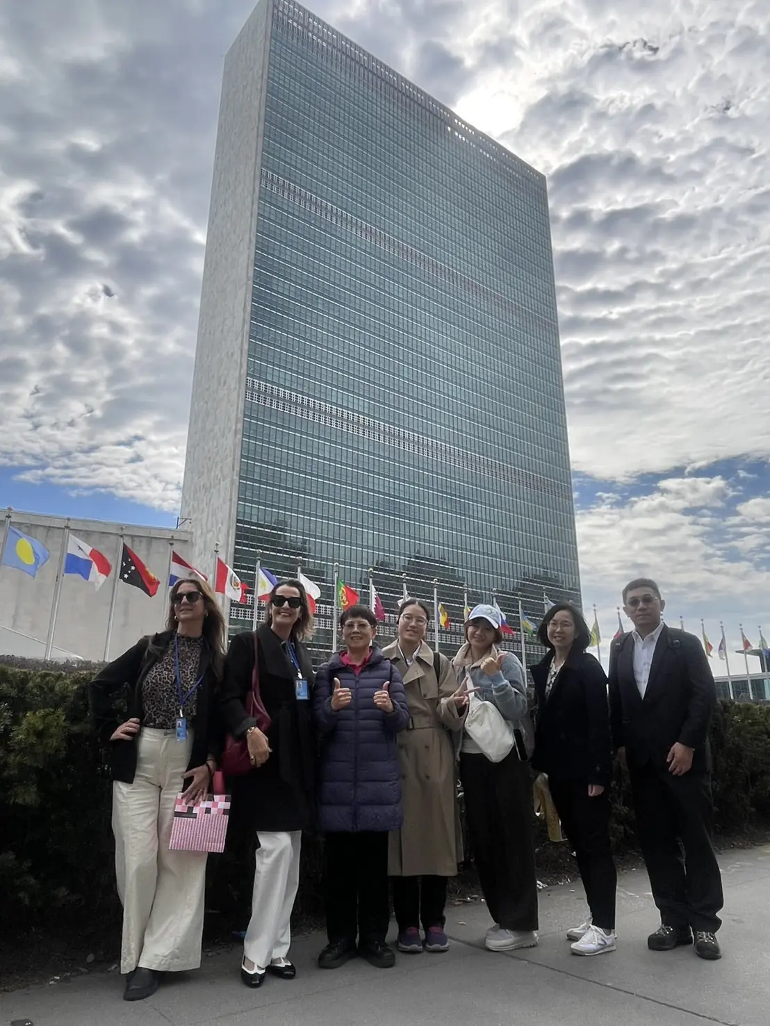 活動期間,屏東基督教女青年會、國立屏東科技大學與台灣世界快樂聯盟代表團也在紐約聯合國總部前與阿根廷Camino國際組織代表團合影留念。