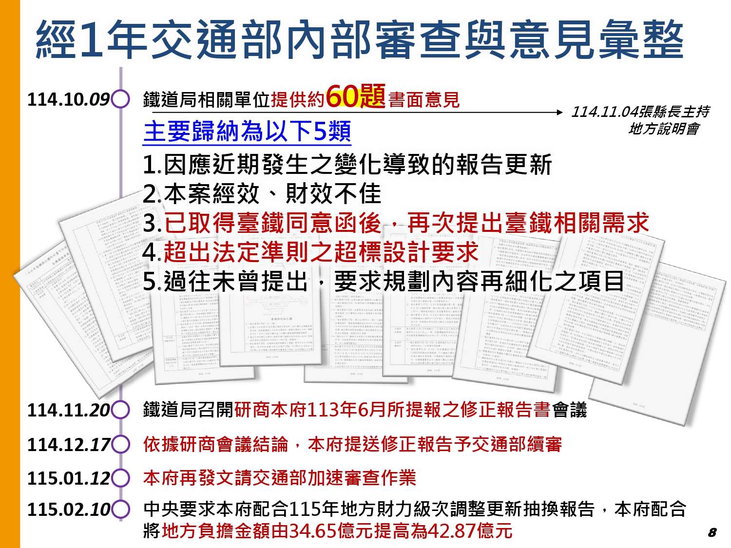 張麗善縣長表示,縣府在技術共識形成後,立即展現高度行政效率,於114年12月完成修正報告送審,並持續函請交通部加速審查。她指出,斗六市平交道已發生多起事故,造成4死1傷之憾事,凸顯本案不僅是交通建設,更是攸關生命安全的工程,行政審查每提前一天完成,便能更早降低交通風險、守護民眾通行安全。