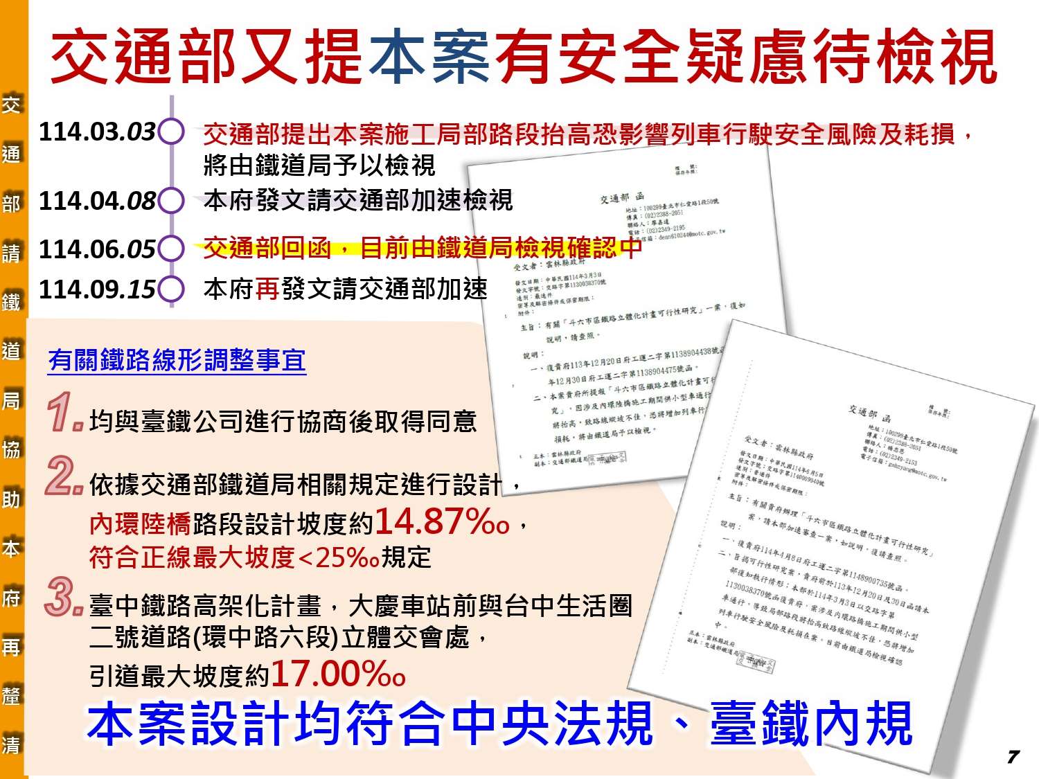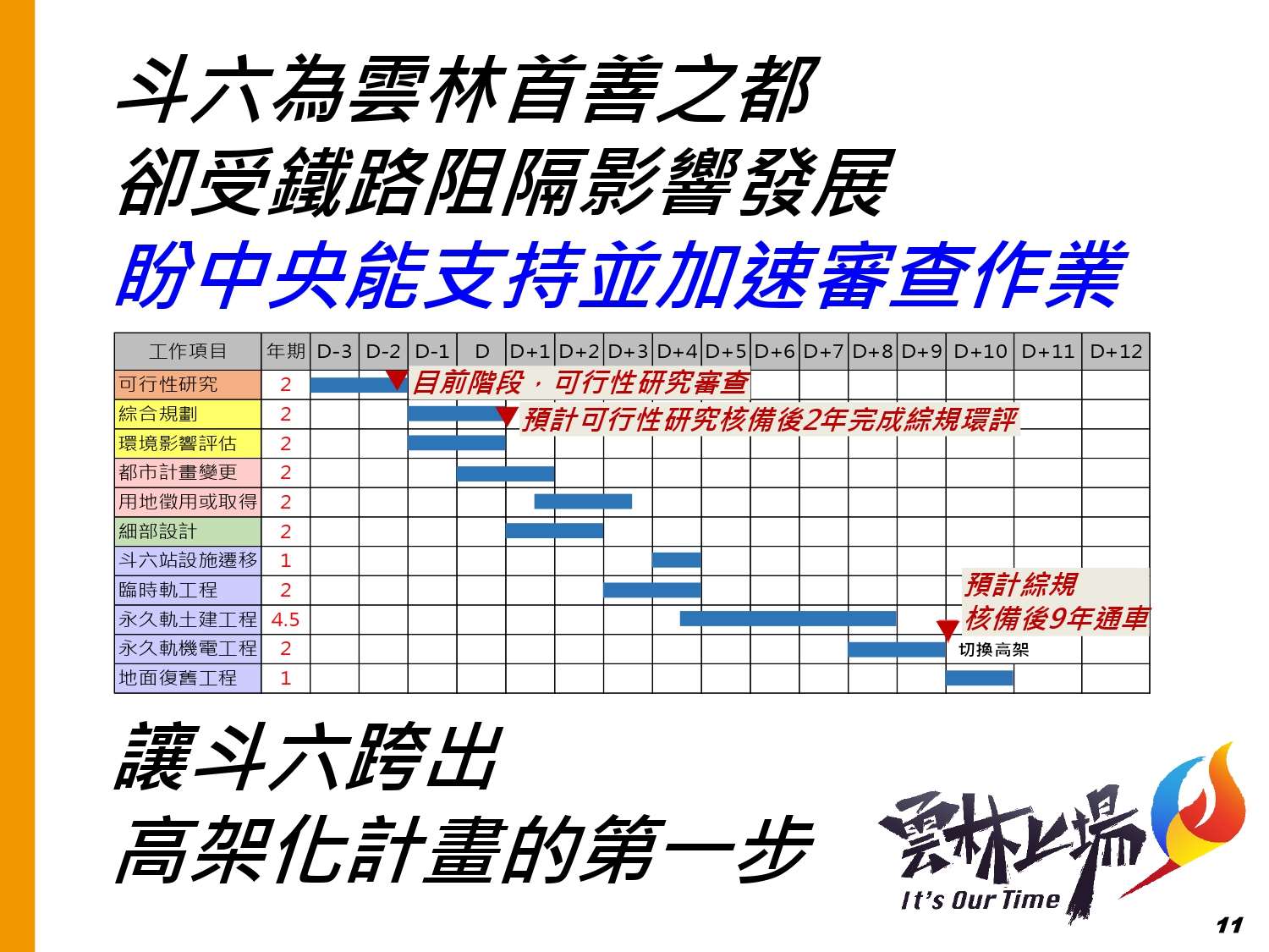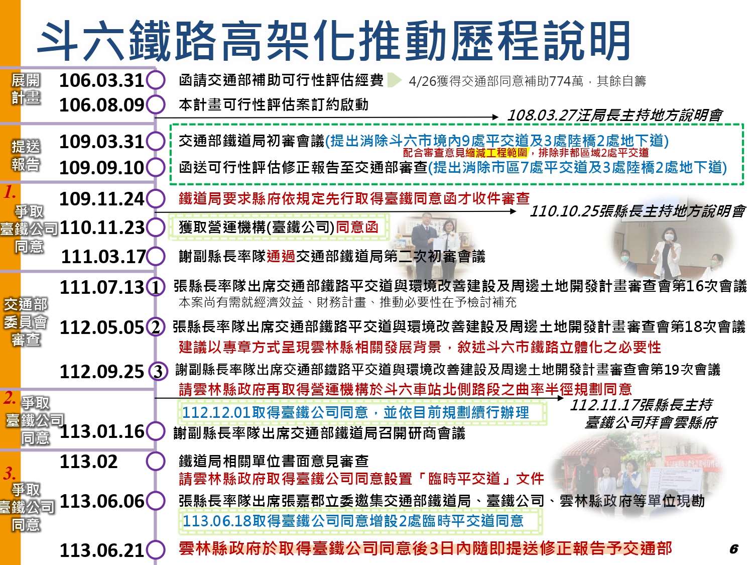 交通部路政及道安司司長吳東凌表示,斗六鐵路高架化為地方重要交通建設,因斗六交通條件較為複雜,前期花費較多時間評估與審查,感謝張麗善縣長、韓國瑜院長及多位立委長期關心與協助,隨著相關問題已大致釐清,計畫也已經送至交通部,後續將加速審查程序,希望趕快順利通過。