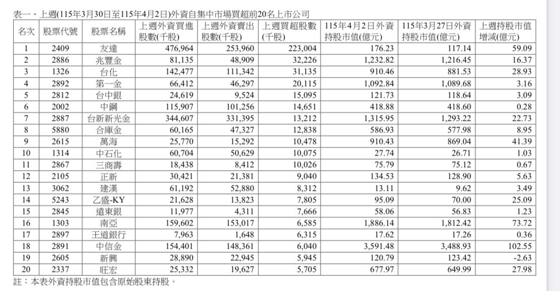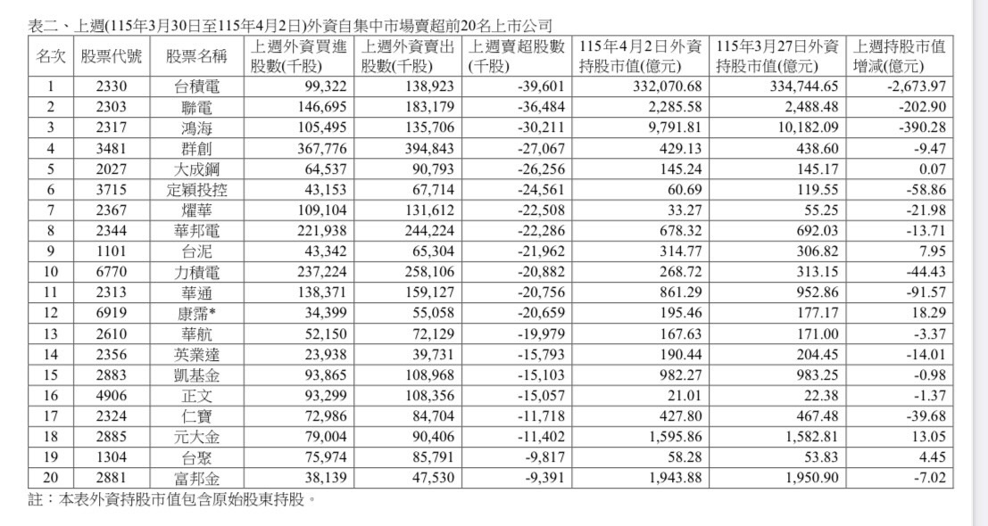 根據臺灣證券交易所統計,上週(115/3/30~115/4/2)外資在集中市場總買進金額為 10,668.20 億元,總賣出金額為 12,269.47 億元,賣超為 1,601.27 億元。另統計自 115 年年 初至 4 月 2 日止,外資總買進金額為 15 兆 7,107.76 億元,總賣出金額為 16 兆 5,597.17 億 元,累計賣超為 8,489.41 億元。