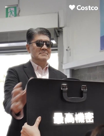 此次活動好市多亞太區總裁張嗣漢親自上陣拍影片,他化身神秘黑衣人,手提「最高機密」皮箱,解鎖會員護照優惠情報內容。圖翻攝自台灣好市多臉書