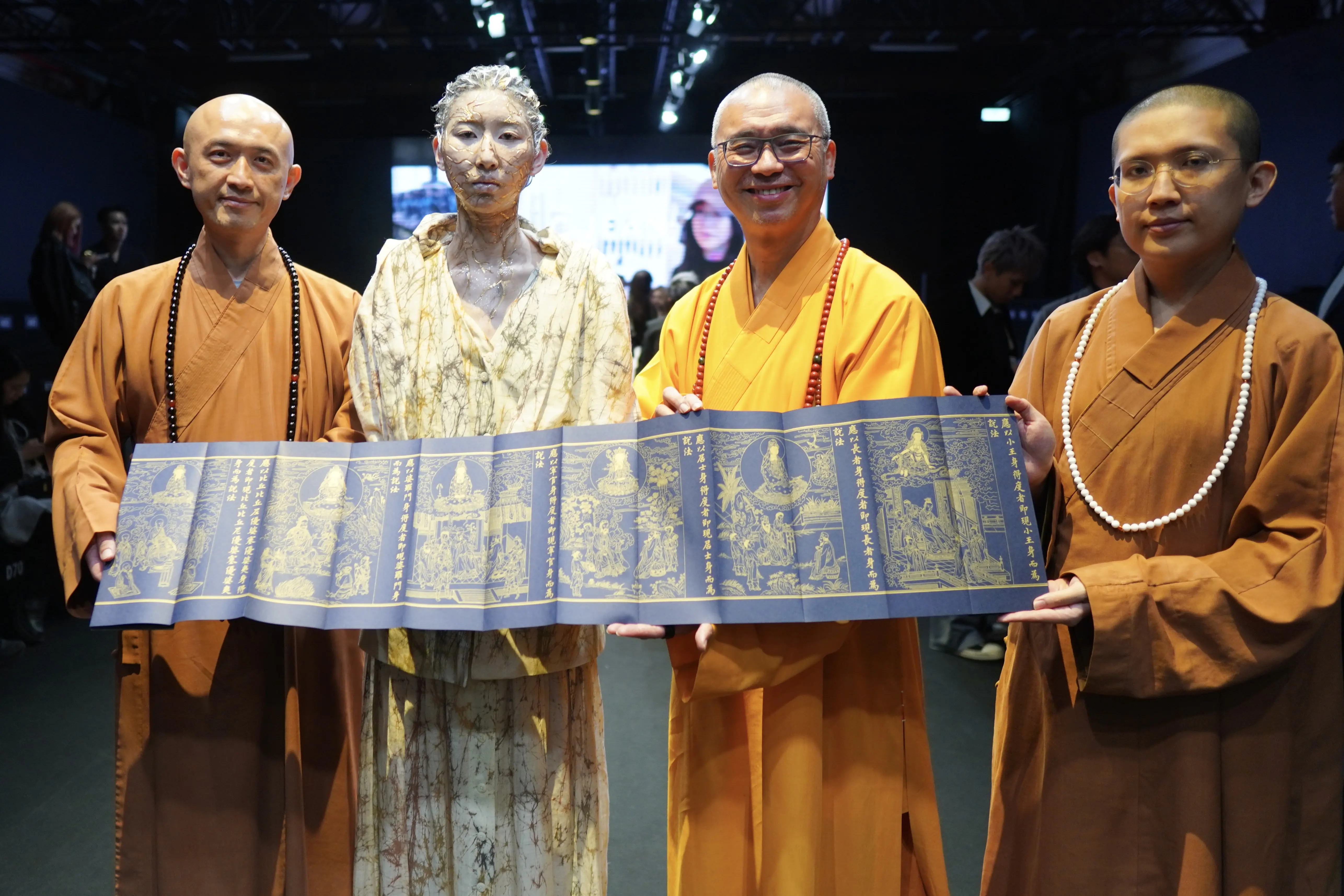 圖:楠西萬佛寺 法藏大和尚與師父應邀出席由文化部主辦之 26AW 臺北時裝週開幕首場活動,伸展台展示之觀音菩薩普門品為國立故宮博物院與僧伽林文化出版有限公司合作之國寶復刻文創。圖/楠西萬佛寺