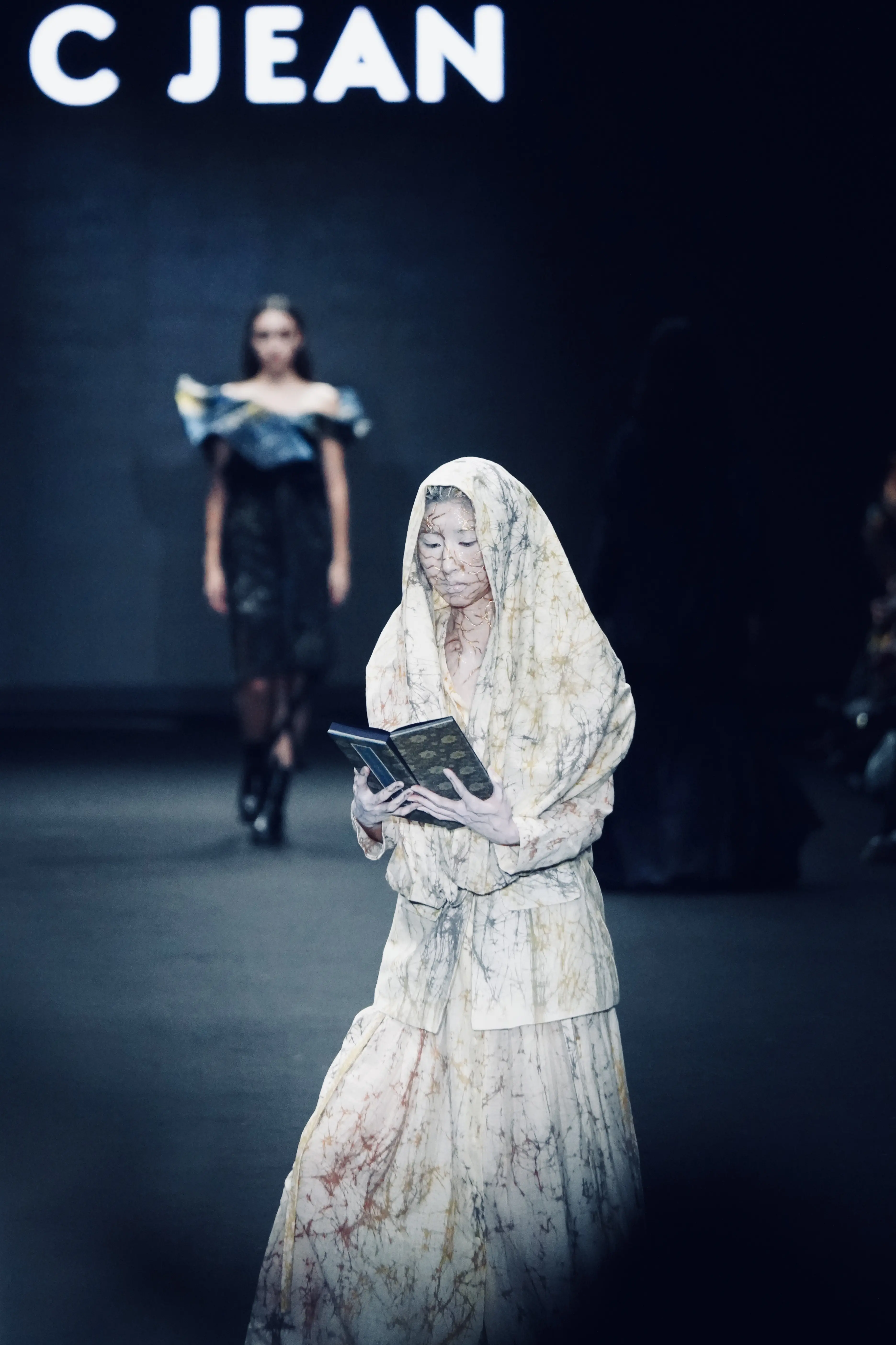 圖:C JEAN 作品於 26AW 臺北時裝週開幕秀展現「SA TA NA MA」生命循環與佛學哲思,模特兒於伸展台以持經書(觀音菩薩普門品)演繹, 展現宗教信仰對於生活的心靈支持力量。圖/楠西萬佛寺