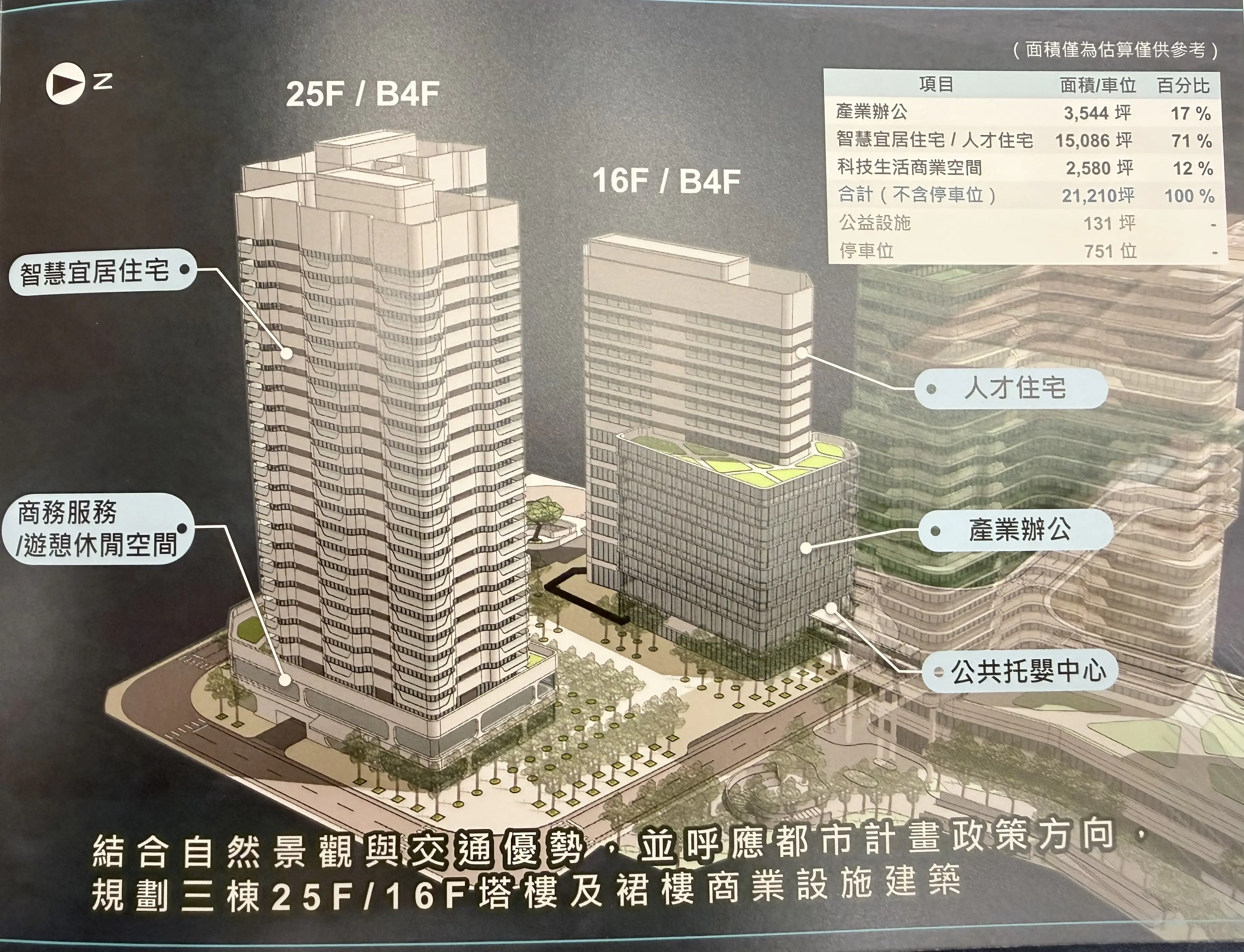 圖説:結合自然景觀興交通優勢:並呼應都市計畫政策方向。規劃三棟25F/1F塔樓及裙樓商業設施建築。(記者王承綸/翻攝)