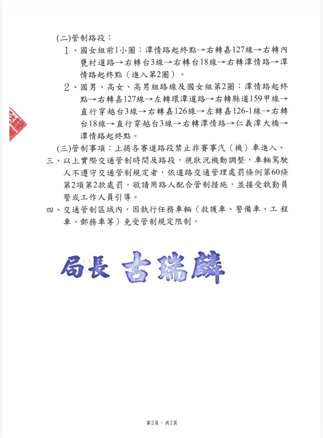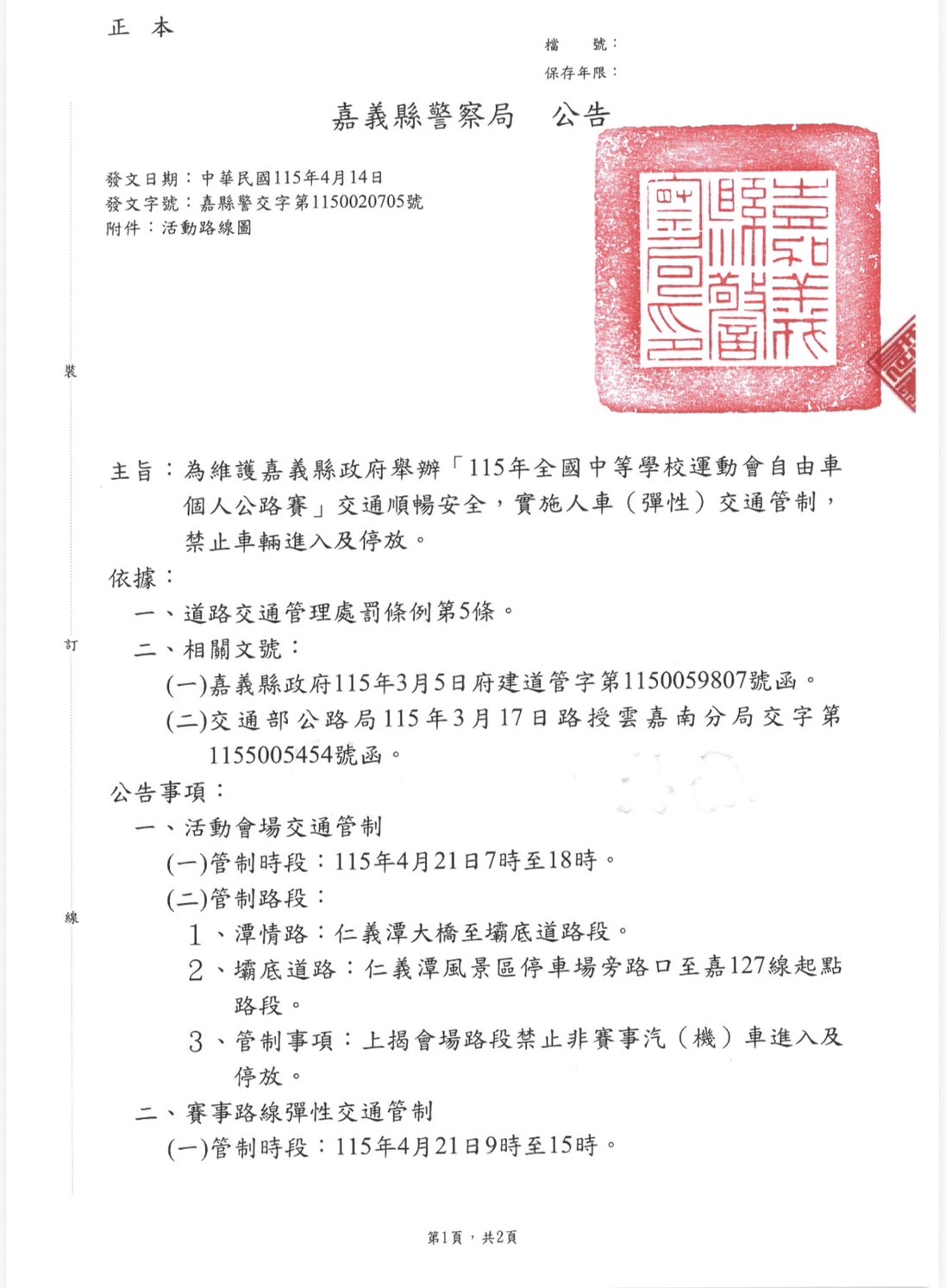 一、115 年全國中等學校運動會自由車個人公路賽,訂於4月21日上午9時至下午4時在本縣中埔鄉、番路鄉台3線(新福村-台18線段)、台18線(樹木銀行-潭情路)、縣道159甲線(平畑-番路鄉公所)、嘉126、126-1、127線及仁義潭環潭(義德寺-159甲)等道路舉行,採部分道路全線封閉管制、部分道路動態管制。