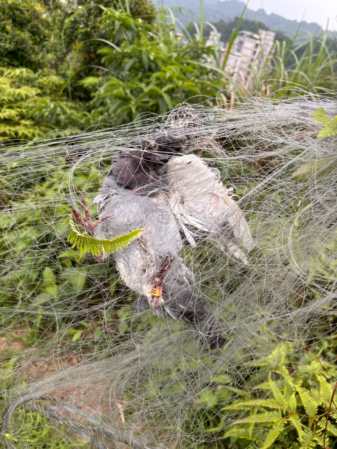 除了這隻倖存的黑鳶,現場網具上的鳥禽屍體還包含1具保育類遊隼,其餘幾乎全數皆為鴿子。動保所研判,由於近日適逢北海春季鴿賽,這片大型鳥網極可能是不肖擄鴿集團為攔截賽鴿所架設的陷阱。為免更多生態受害,動保所已當場將這片為害山林的大型鳥網一次性全數清除。