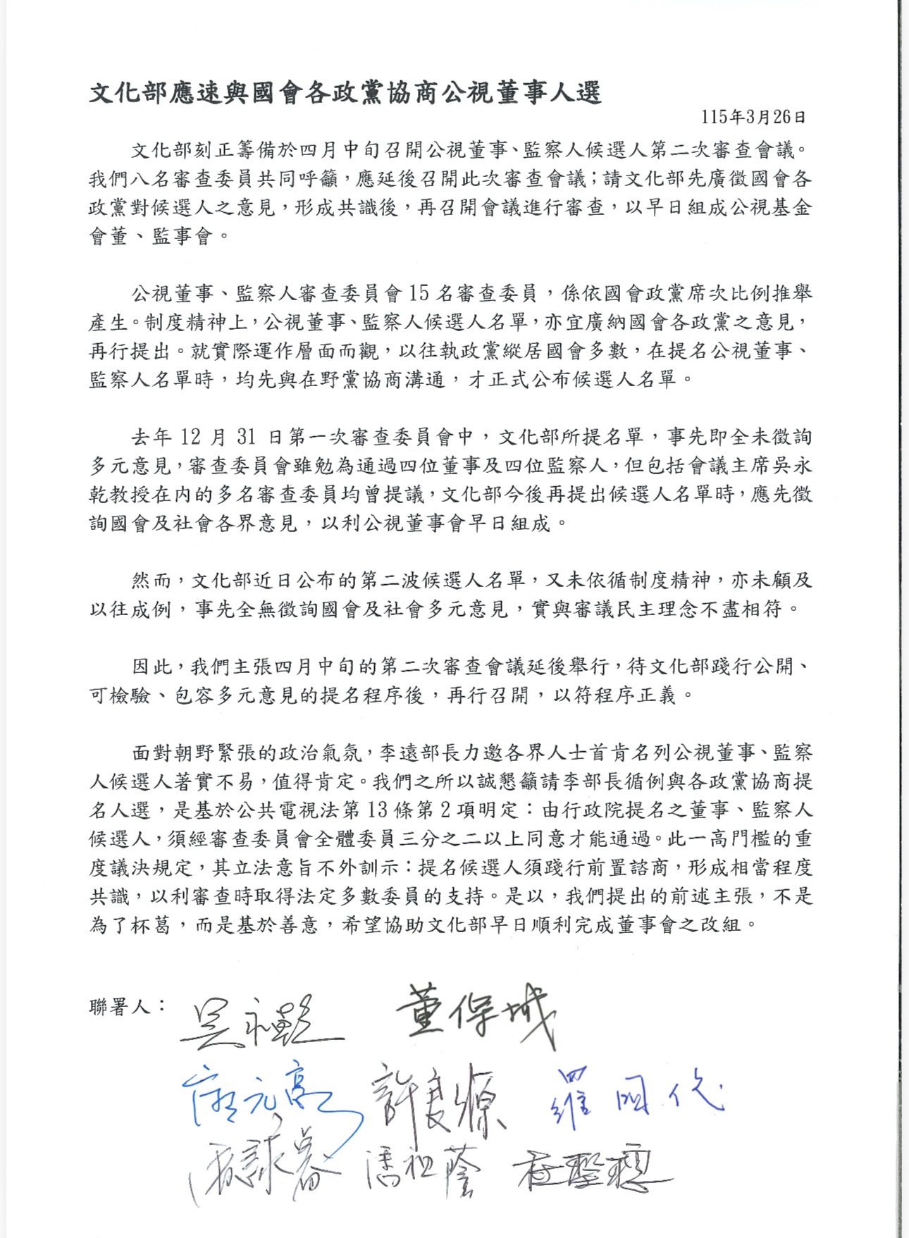立法院審查公視第八屆董監事人事案爭議不斷。獲立法院推舉的8名審查委員包括吳永乾、羅國俊、廖元豪、董保城、馬詠睿、許良源、潘祖蔭、杜聖聰,今日(9日)聯名致函正式向立法院長韓國瑜請辭審查委員職務。公開信表示,因文化部李遠部長不遵循公共電視法立法精神,且違反歷屆經由國會不同政黨事前協商候選人名單慣例,一再依個人意志辦理提名,難以履行立院託付的審查責任,決定聯名請辭以示負責。