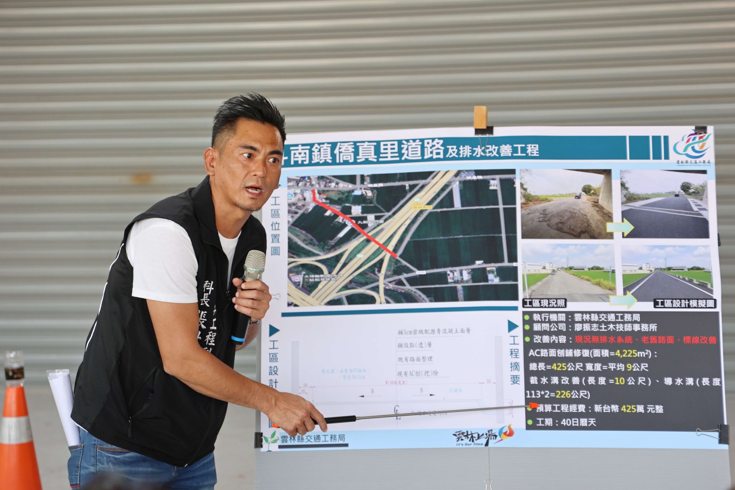 斗南鎮僑真里道路及排水改善工程,改善道路總長計約425公尺、舖面改善面積約為4,225平方公尺,導水溝(涵洞兩側)總長約226公尺,截水溝約計10公尺,改善經費為新台幣425萬元整,工期為40日曆天,改善後可提升該區道路行車安全及居民生活品質。