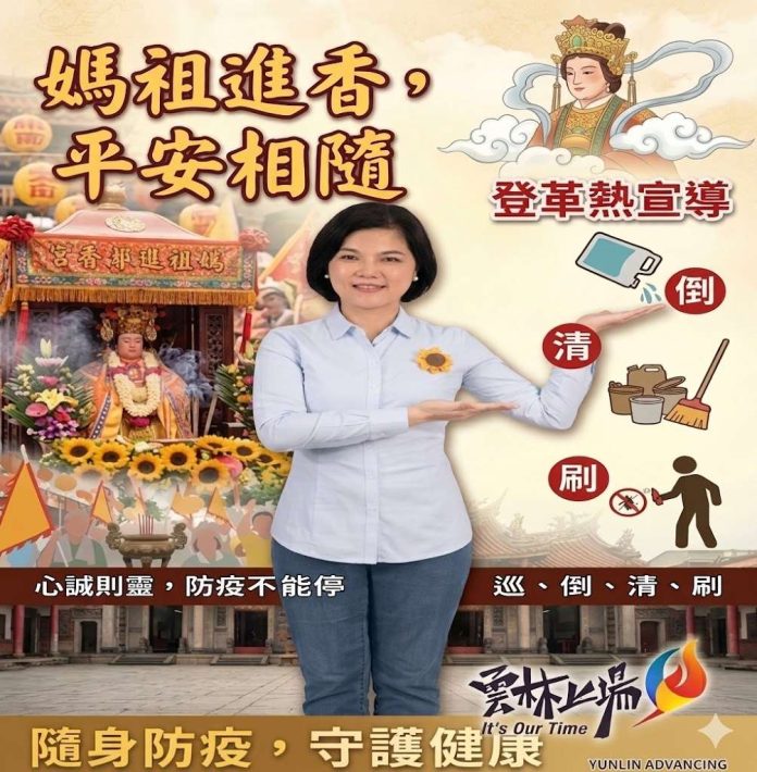 副縣長陳璧君表示,登革熱防治須全縣同步推動,尤其配合白沙屯媽祖進香期間,更需提前整備。鑑於本縣112年曾於古坑鄉發生登革熱疫情,另國家衛生研究院調查,北港地區曾被發現埃及斑蚊孑孓,該蚊種傳播速度快,一旦發生疫情,易於短時間內擴散,顯示本縣登革熱防治工作更須審慎防範,不可掉以輕心,已責成各局處及鄉鎮市公所、衛生所,皆需針對高風險場域加強孳生源清除,落實「 巡、倒、清、刷」。