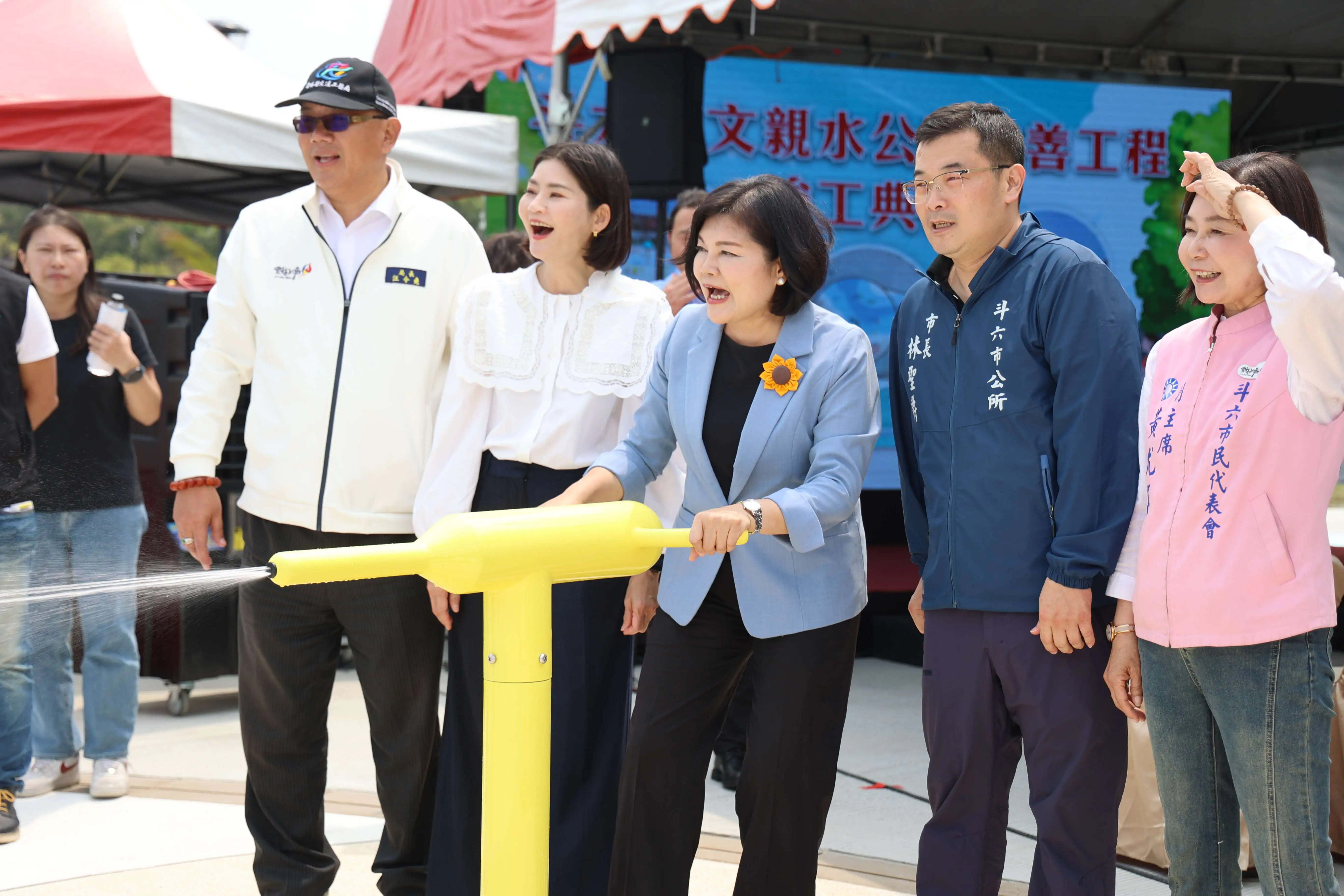 今日斗六人文親水公園改善工程竣工典禮,縣長張麗善、副縣長陳璧君、雲林縣交通工務局長汪令堯、縣府地政處長葉永星、新聞處長陳其育、斗六市長林聖爵、陳芳盈議員、陳永修議員、斗六市民代表會主席胡克勤、副主席黃尤美、林益豪代表、李美瑤代表、石豐瑋代表、斗六各地里長共同揭幕,現場並由鎮南國小棒球隊小朋友提前開箱,孩子們開心體驗戲水樂趣。