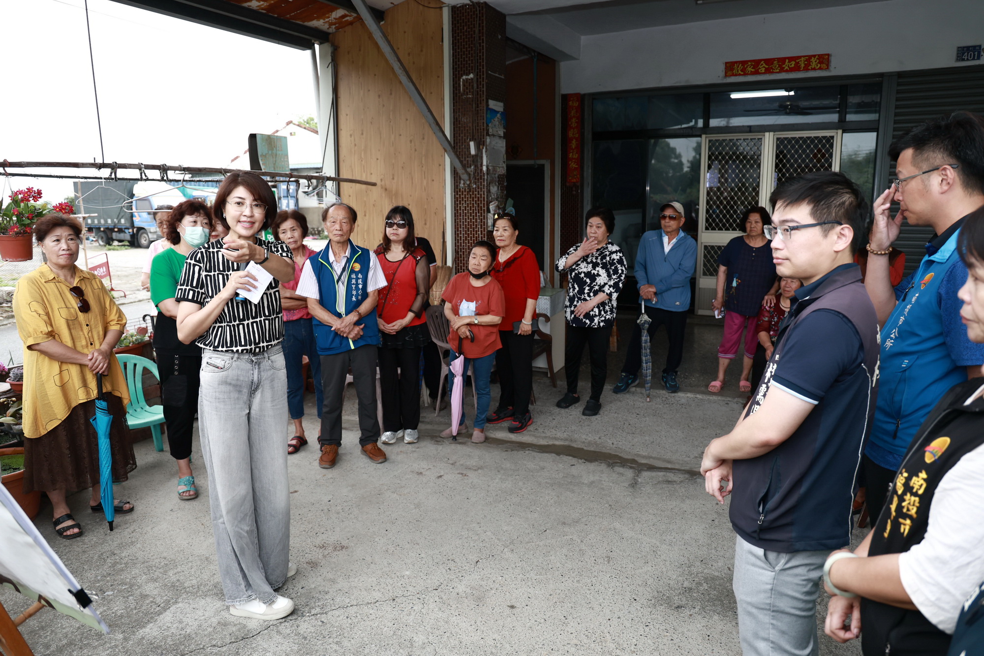 許縣長一行首先前往南投市樂利路會勘道路改善,並簡報彰南路一段1巷道路改善工程,縣議員林儒暘、張秀枝與多位鄉親都到場關心,其中樂利路因鄰近南投國宅、五育中學與旺來園區,人車經過頻繁,部分路段已陸續改善完成,此次預計投入250萬元完成最後200公尺的路面改善工程。