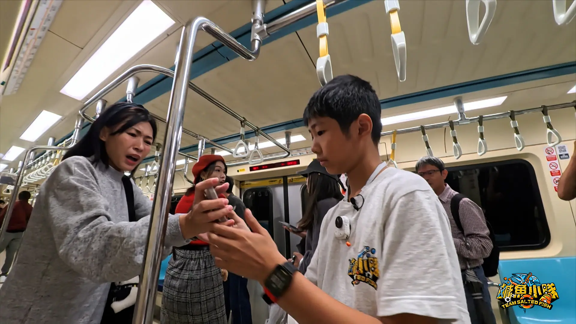 《鹹魚小隊》第二季「隨機傷人」篇為真實還原事發現場,選擇行駛中的捷運拍攝,並安排臨演扮演乘客。 圖片提供:公視