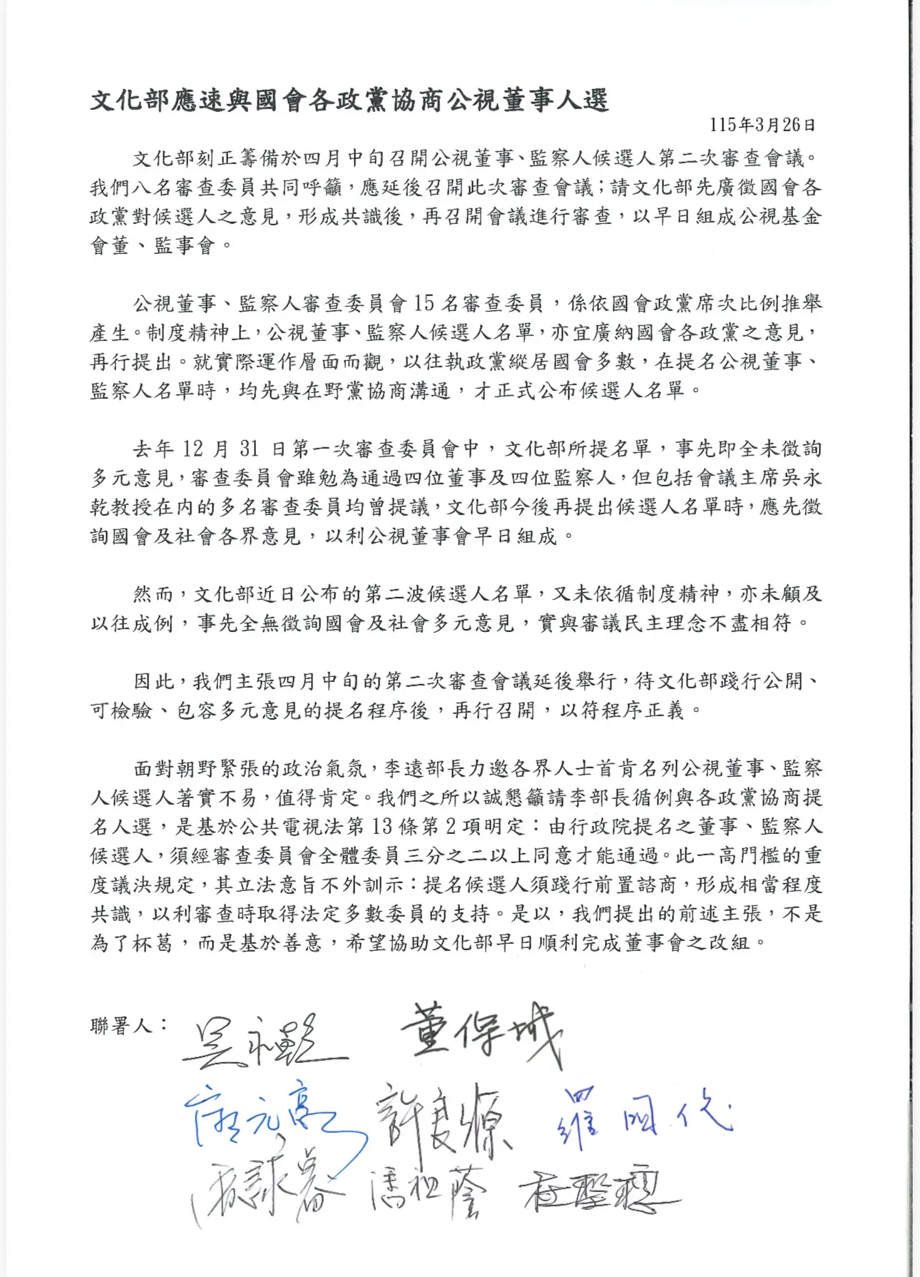 這封公開信以「文化部應速與國會各政黨協商公視董事人選」為名,署名審查委員包括吳永乾