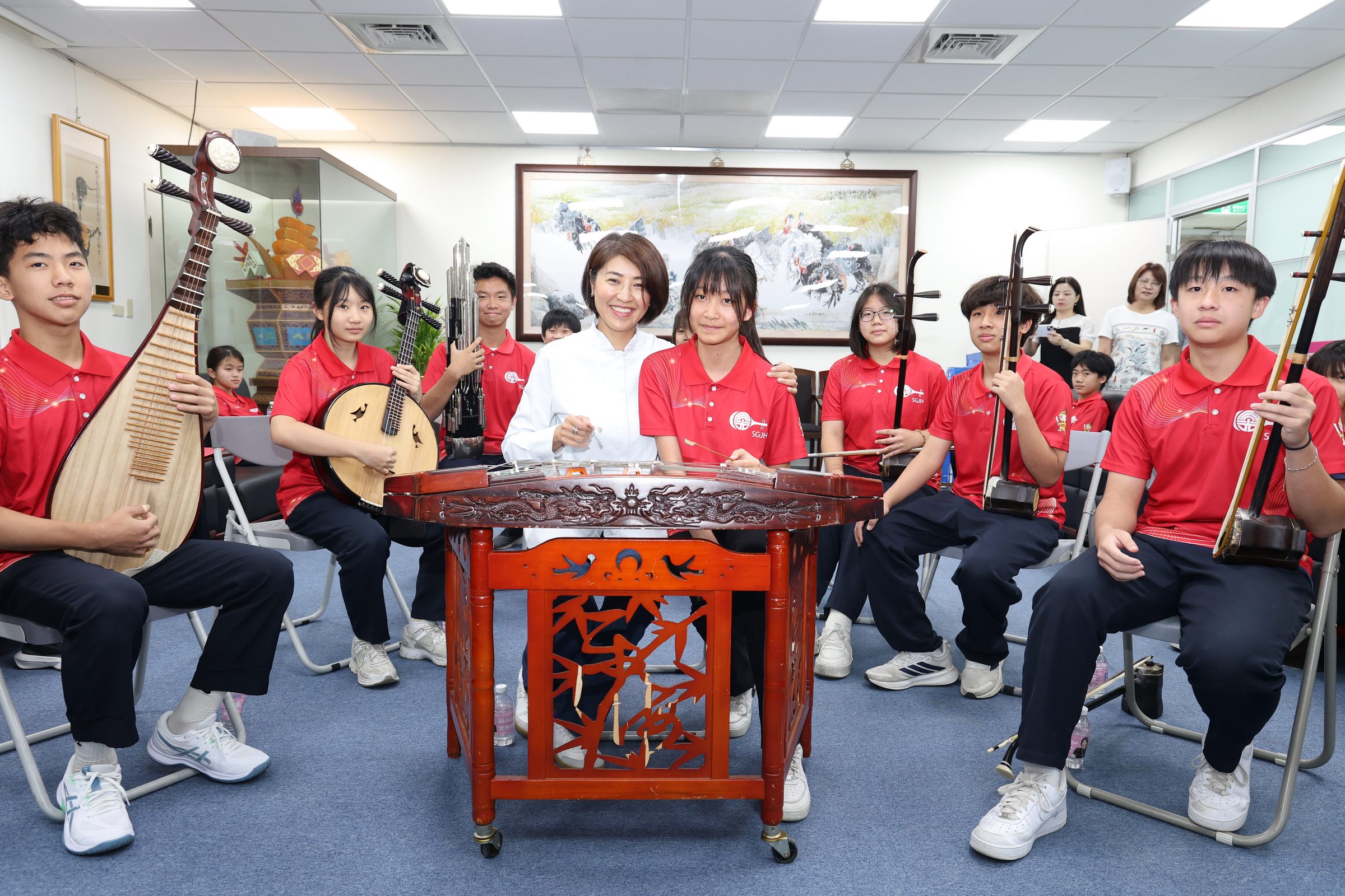 接見過程氣氛溫馨,出席的許縣長和副縣長王瑞德、縣府教育處長王淑玲、縣議員林儒暘及三光國中校長吳明順、 家長會長賴妍卉、後援會會長張月娟,一同欣賞全國特優三光絲竹樂團的精彩演奏,許縣長還忍不住躍躍欲試的向團員討教,並試彈琵琶及揚琴,悠揚樂聲迴盪於縣府,令在場嘉賓驚艷不已,許縣長深有感觸的說「真好,今天和三光的孩子見面讓縣府文藝氣息倍增」。