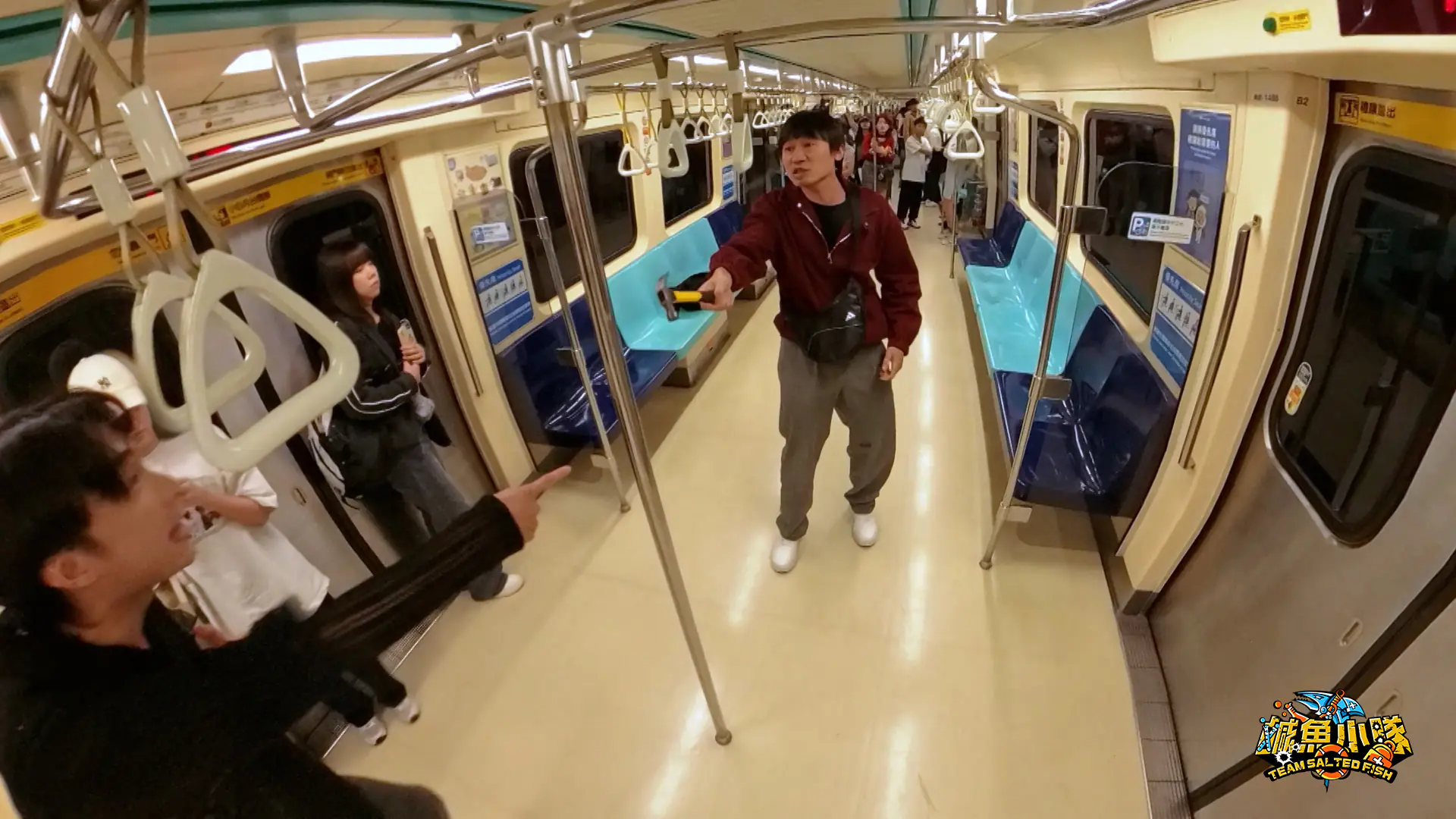 《鹹魚小隊》第二季「隨機傷人」篇為真實還原事發現場,選擇行駛中的捷運拍攝,並安排臨演扮演乘客。 圖片提供:公視