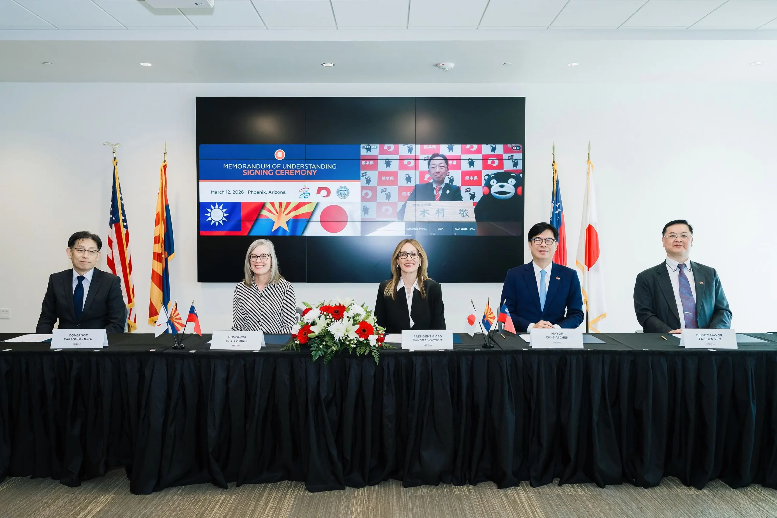 高雄市長陳其邁於美國時間12日下午率市府訪團拜會亞利桑那州政府,與亞利桑那州長凱蒂·霍布斯(Katie Hobbs)進行會晤,並與亞利桑那州、熊本縣共同簽署三方經濟交流促進備忘錄(MOU),熊本縣知事木村敬不僅指派副知事竹內信義率團,木村敬也親自線上出席參與台美日三方簽約的時刻。此舉不僅象徵台、美、日三地確立「半導體戰略三角」,更寫下地方政府透過產業連結,共同維護全球供應鏈安全與民主陣營韌性的關鍵一頁。