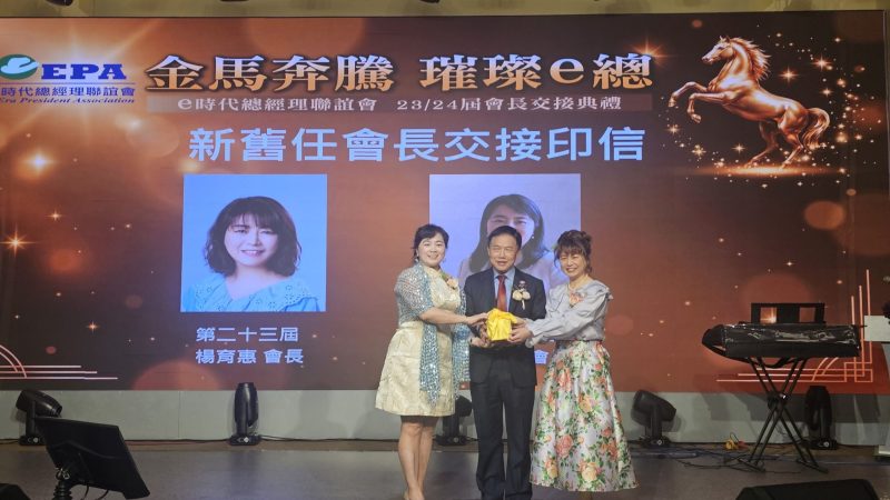 台灣知名企業菁英組織「e時代總經理聯誼會」15日舉辦「第23、24屆會長交接典禮」。現場冠蓋雲集,在創會長李萬進與歷任會長的共同見證下,現任會長楊育惠將重任正式傳承予第24屆新任會長許依倫,展現 e 總「傳承、共榮、創新」的家族精神。典禮由林鴻輝與李玥嶠擔綱主持,在莊嚴且溫馨的氣氛中,展現了 e 總家族跨越 20 餘載的深厚情誼。