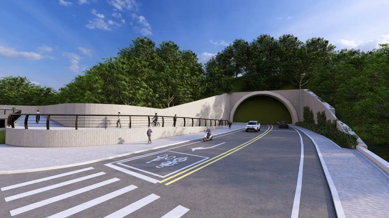 二、 低碳先行:獨立人行與自行車專用道響應永續城市目標,隧道內採單孔雙向配置,並特別規劃了寬達 3 公尺獨立的行人與自行車空間。這不僅保障了慢行者的安全,更建構出從捷運南港站出發的低碳通勤動線,讓「綠色園區」的理念進一步延伸。
