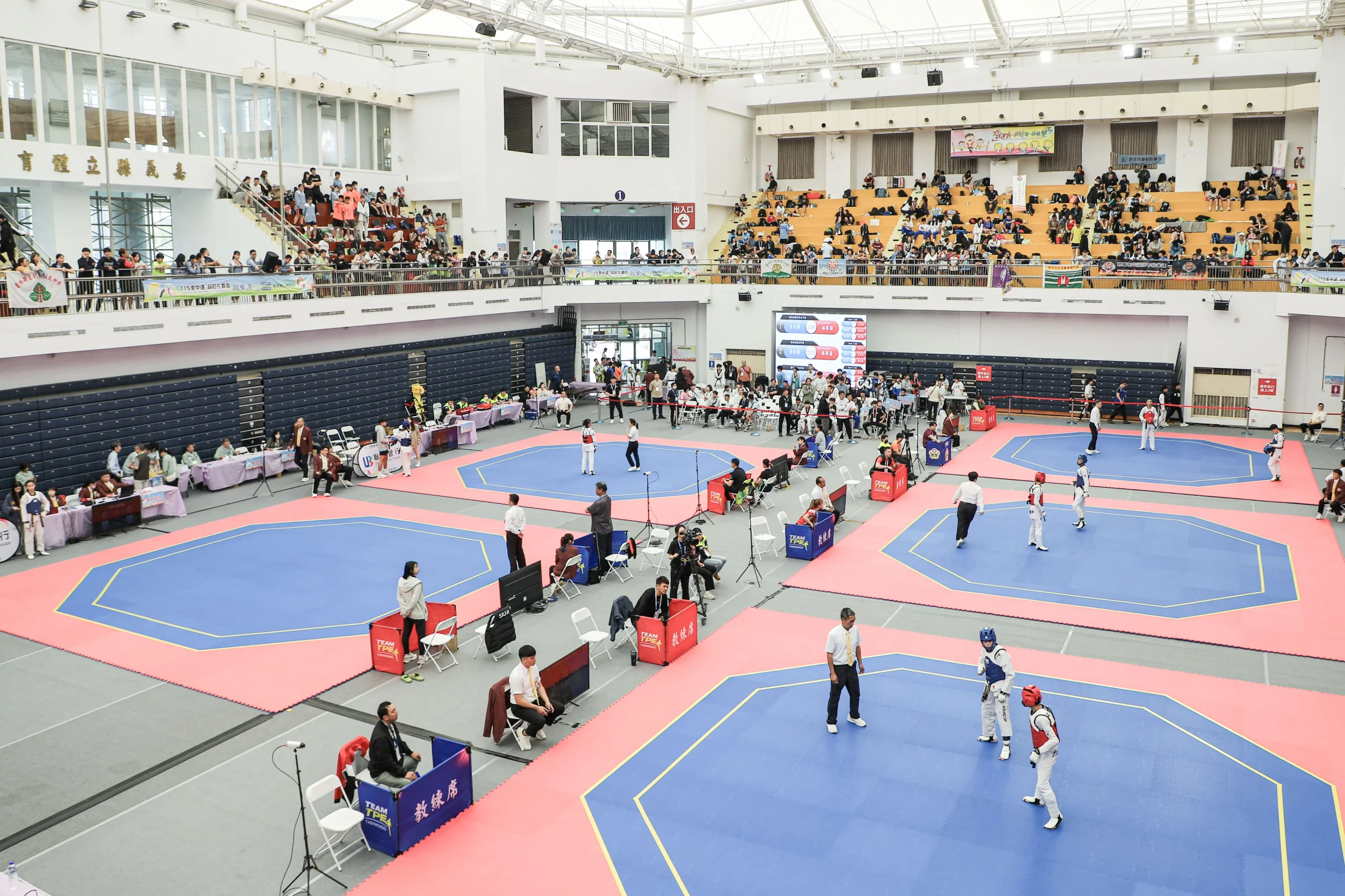 每日早上8點進行抽磅與過磅程序,9點比賽正式開始,對打項目採電子護具與電子計分系統,今日賽事中各縣市選手全力以赴,攻守轉換迅速,展現跆拳道對打的爆發力與競技張力,考驗選手反應、戰術判斷與技術運用能力。