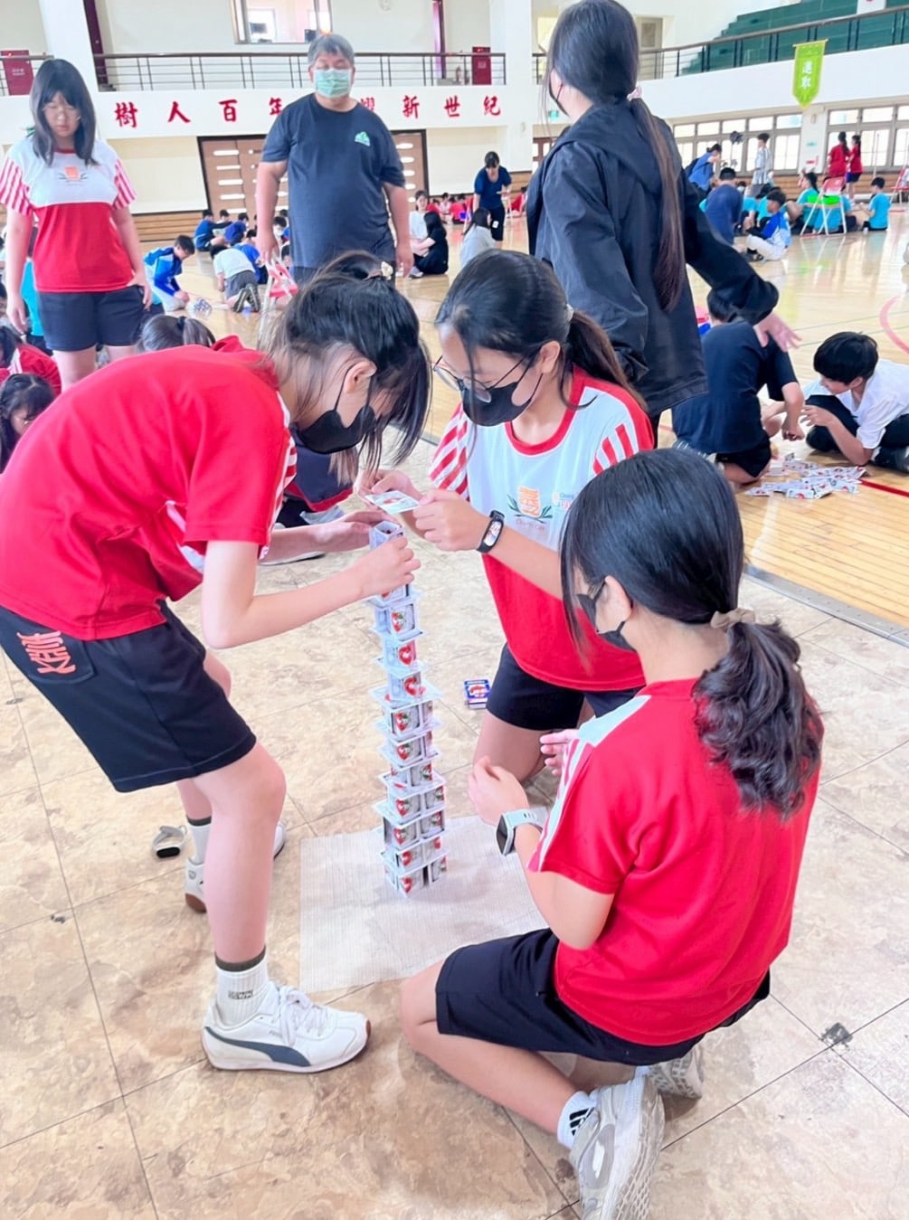 挑戰賽當天的重頭戲為「挑戰101-STEAM高塔建造賽」,結合全校分組挑戰活動於游藝館盛大展開,活動融入STEAM概念並介紹世界知名高塔建築,拓展學生國際視野,學生以撲克牌進行任務挑戰。其中五年級挑戰以「越高越好」為目標,特別考驗團隊在結構設計與穩定度上的表現,五年10班的小組同心協力,成功堆疊出70幾公分高的作品,表現亮眼。5年10班這個小組說:「一開始高塔一直倒下來,我們有點緊張,但一起討論怎麼調整後就越疊越穩,最後成功完成真的很有成就感,也學到合作很重要。」學生在不斷嘗試與修正中完成作品,現場氣氛熱烈。