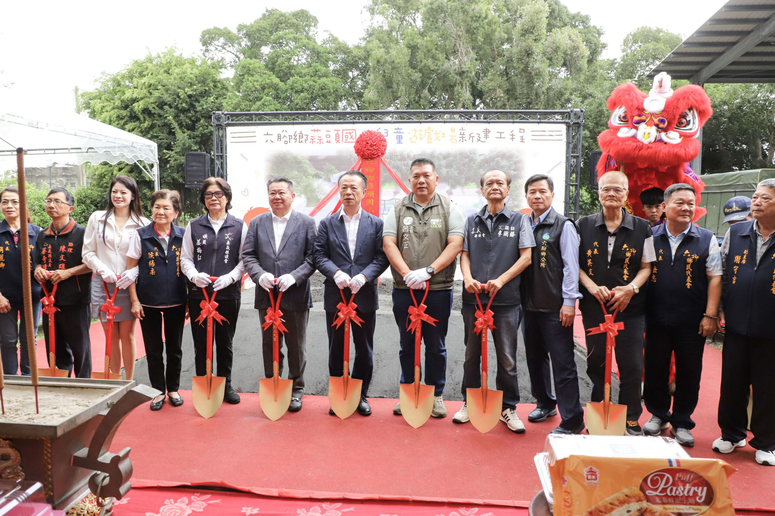 嘉義縣政府持續推動特色公園遊戲場建置計畫,今7日舉行六腳鄉蒜頭國小附設遊戲場工程動土典禮,縣長翁章梁及副議長陳怡岳等人出席,為工程祝禱祈福。