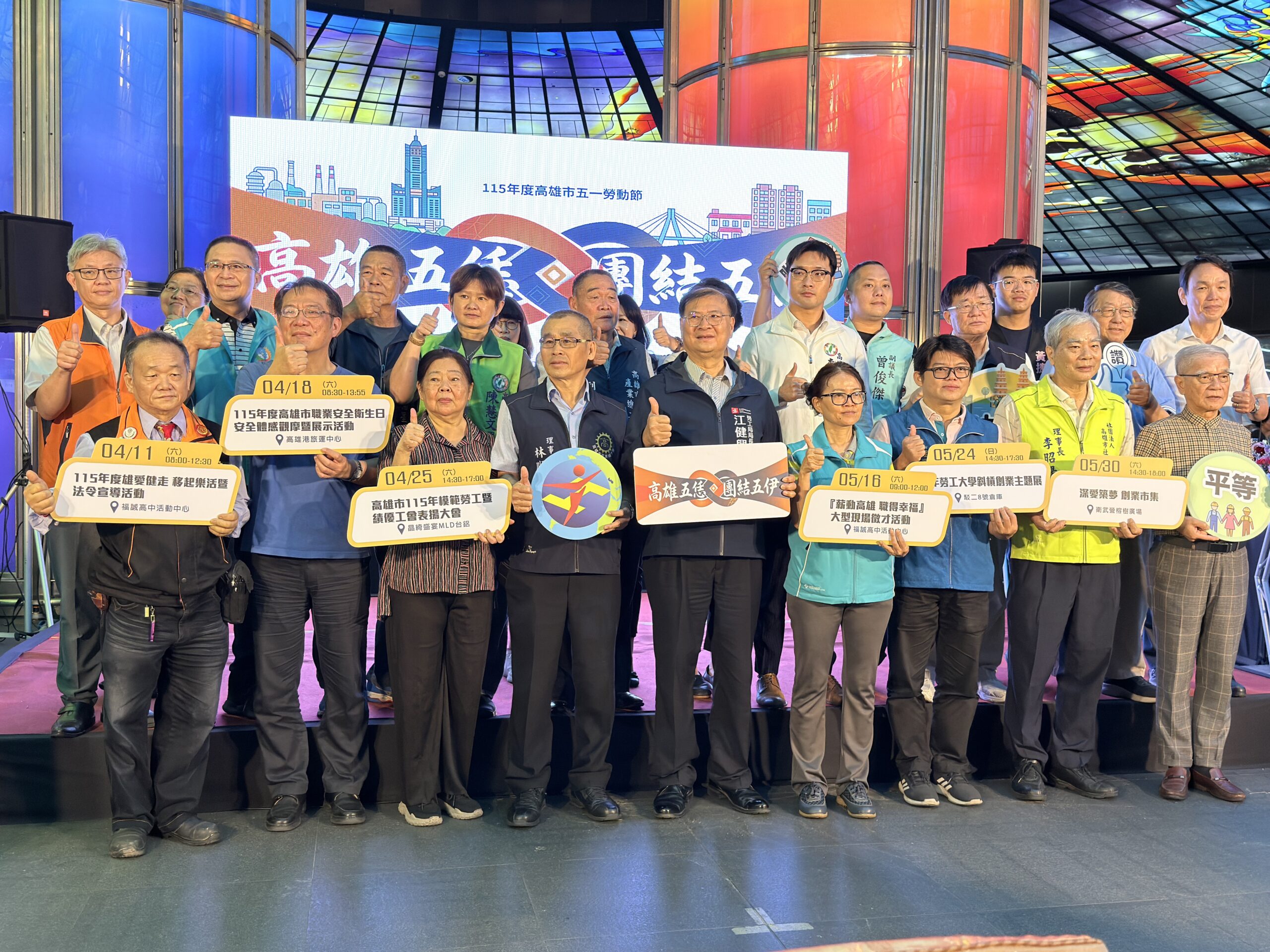 高雄市勞工局(10)日上午於美麗島捷運站光之穹頂舉辦「115年度五一勞動節系列活動啟動記者會」,為今年五一勞動節系列活動揭開序幕,展現高雄持續團結勞工、促進安全健康與勞動權益、活絡人才培育和就業、力挺弱勢族群、實踐平權城市及社會共好的決心。記者會由江健興局長、貴賓及高雄市各工會代表共同啟動及見證下,宣告活動正式開跑,勞動節系列活動將自4月11日起陸續展開,內容多元豐富,包括「雄愛健走、移起樂活暨法令宣導活動」、「職業安全衛生日安全體感觀摩暨展示活動」、「模範勞工暨績優工會表揚大會」、「薪動高雄、職得幸福一大型徵才活動」、「勞工大學斜槓創業主題展」及壓軸登場的「深愛築夢—創業市集活動」,敬邀勞工及市民朋友踴躍參與,一起響應年度盛事。
