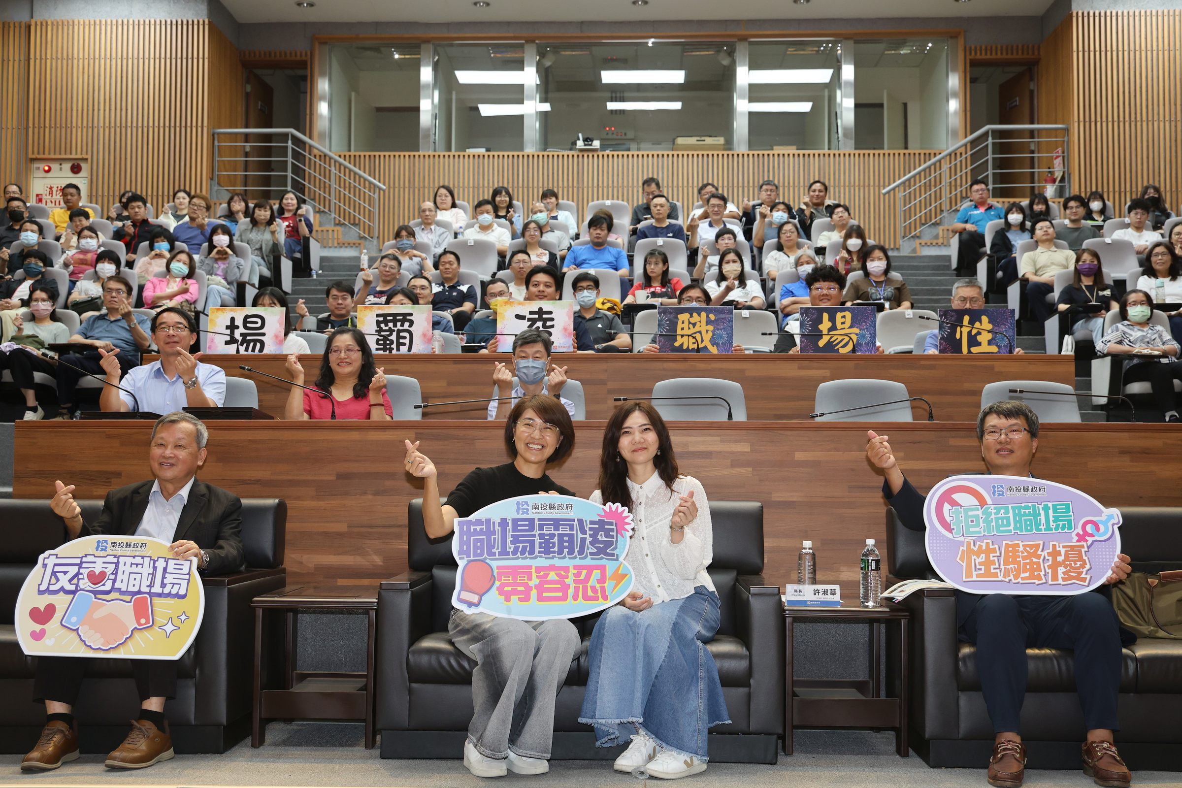 這次員工月會,許縣長與副縣長王瑞德連袂出席,許縣長首先頒獎表彰在各項評鑑表現優異的府內、外單位及個人。並與出席貴賓及與會員工,高舉友善職場、職場霸凌零容忍、拒絕職場性騷擾等標語合影,凸顯南投縣政府對職場性平及員工協助、諮商的重視與落實。