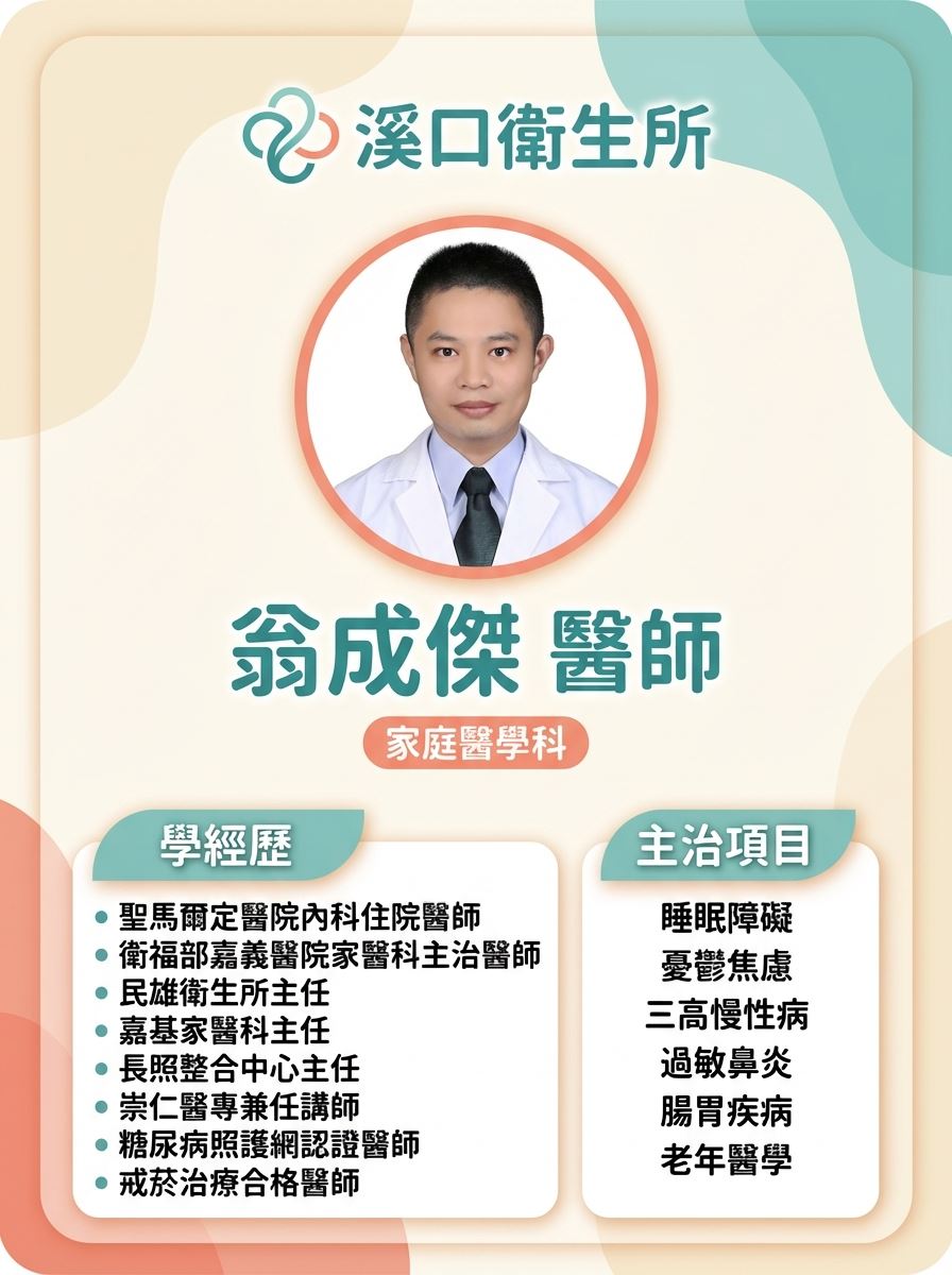 溪口鄉衛生所翁成傑醫師曾任嘉義基督教醫院家醫科及醫療整合中心主任,主治三高慢性病照護等;民雄鄉衛生所李政道醫師具台中童綜合醫院家醫科背景,善長糖尿病及慢性腎病整合照護;嘉義縣慢性病防治所李宛臻醫師為長庚醫院內科醫師,對病人細心又善於溝通。