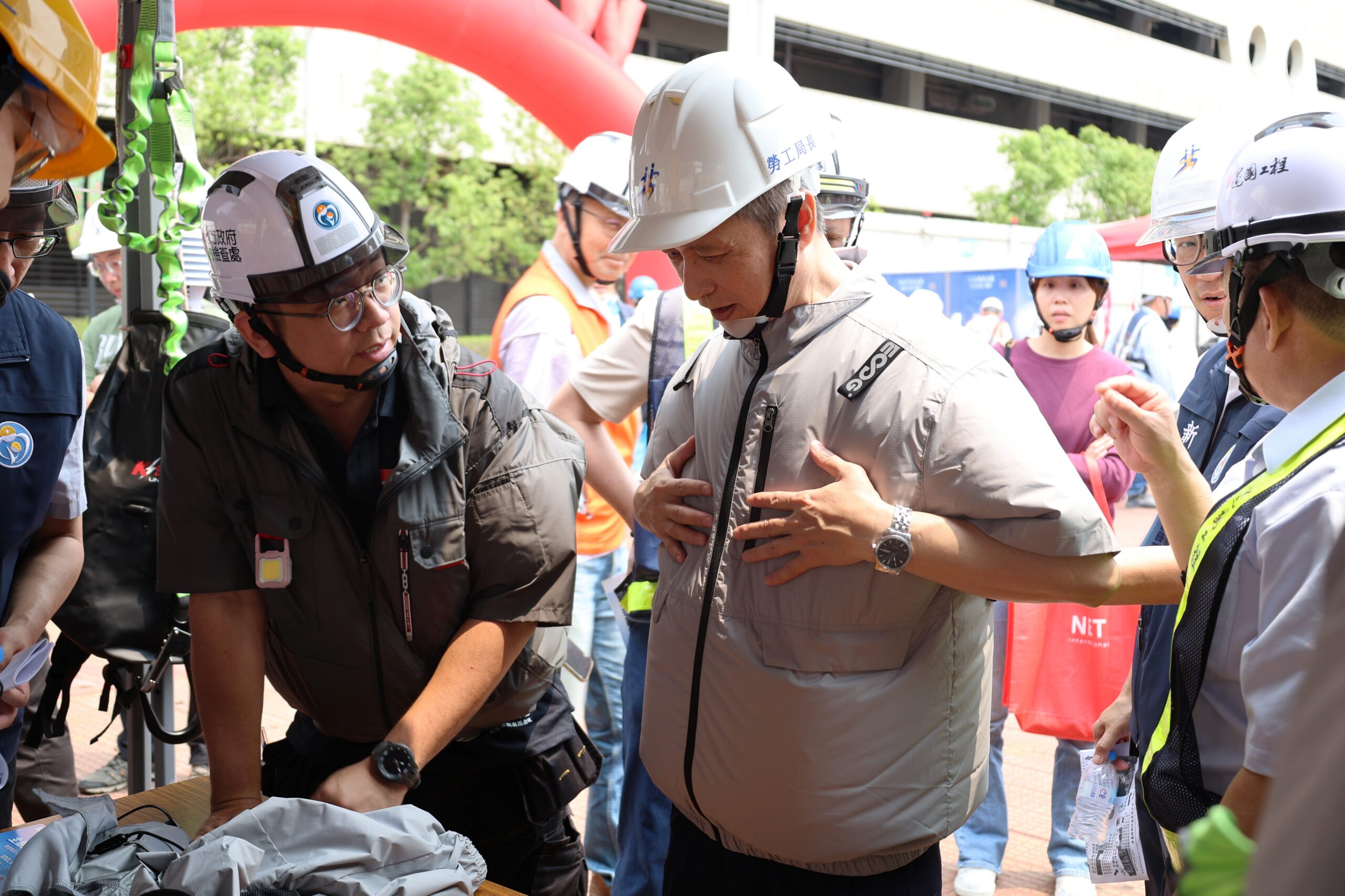隨後大家移動到現場各式降溫設備廠商攤位,瞭解目前最新的發展趨勢。陳局長和林立青對於利用太陽能電池的水霧遮陽模組非常感興趣,頻頻詢問構造細節。另外廠商也展示最長可達30小時的風扇衣,具備防潑水、抗UV、隔熱材質,陳局長也現場試穿感受降溫效果。多元展攤讓與會代表都深覺受益匪淺。陳瑞嘉也一一頒發感謝狀,給所有參與今天觀摩活動的所有夥伴。