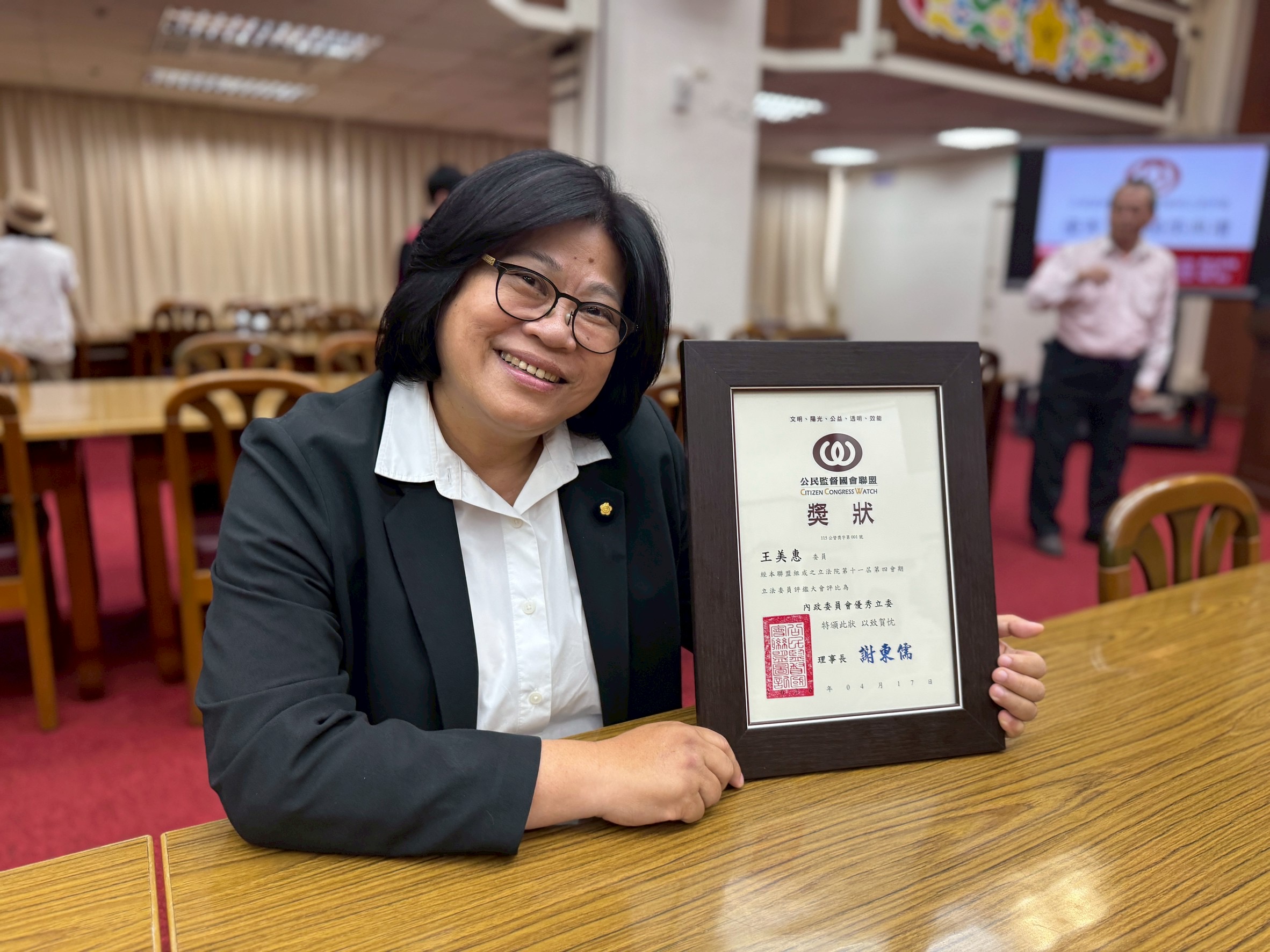 最後,王美惠說,感謝鄉親一路以來的支持與鼓勵,將這份得獎的喜悅,與大家一同分享。未來也會持續秉持認真打拚的初心,不會辜負鄉親對她的期待。