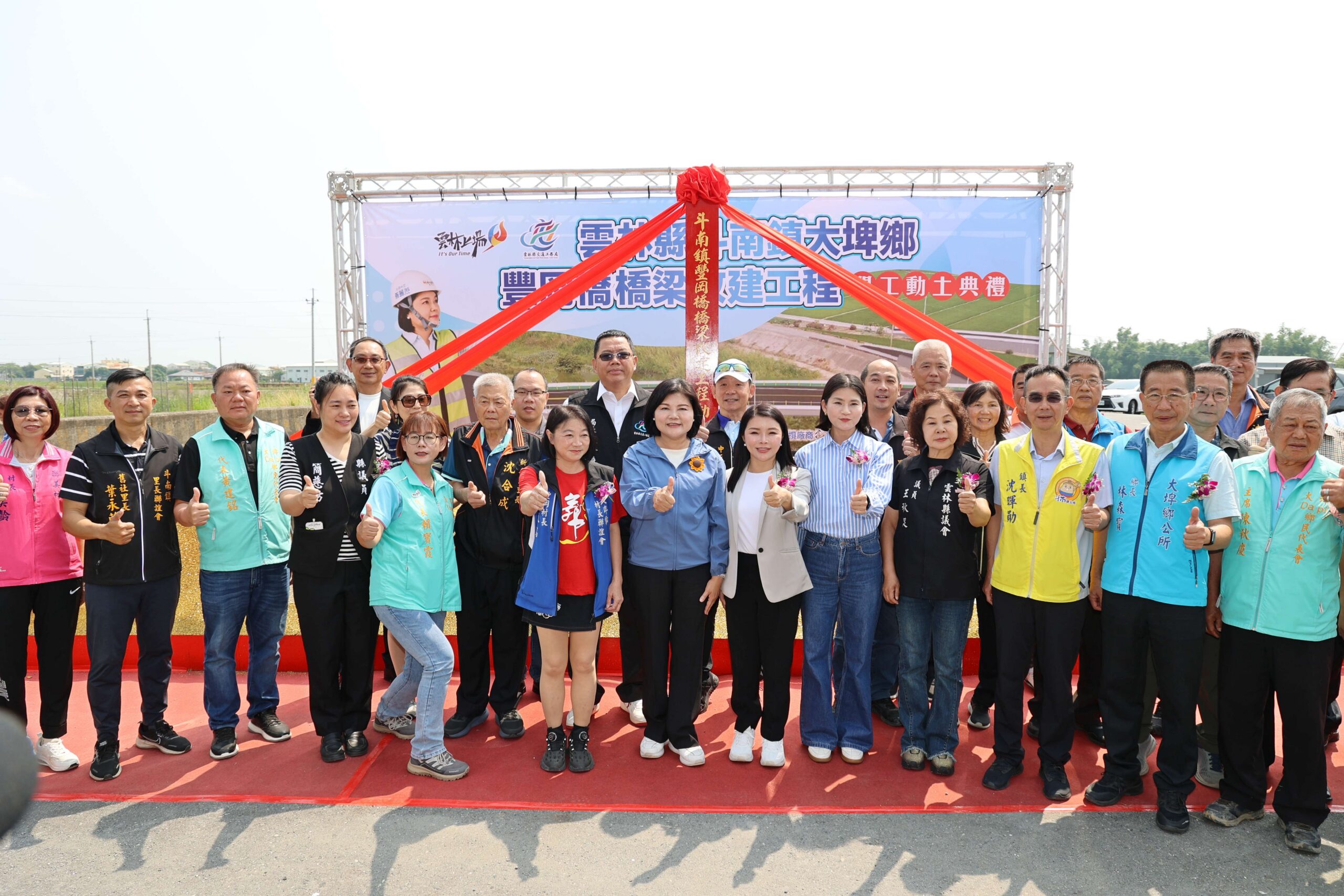 雲林縣長張麗善今(4/21)與副縣長陳璧君、縣政總顧問張清良、交通工務局汪令堯局長及工程團隊,偕同經濟部水利署第五河川分署王銘熙秘書、立法院張嘉郡委員、劉建國委員秘書高明達,縣議員簡慈坊、王秋足議員、斗南鎮長沈暉勛、大埤鄉長林森寳、大埤鄉民代表會主席陳秋慶、斗南鎮民代表會主席陳大華,兩鄉鎮代表及里長、鄉親等出席開工動土典禮,正式宣佈動工。